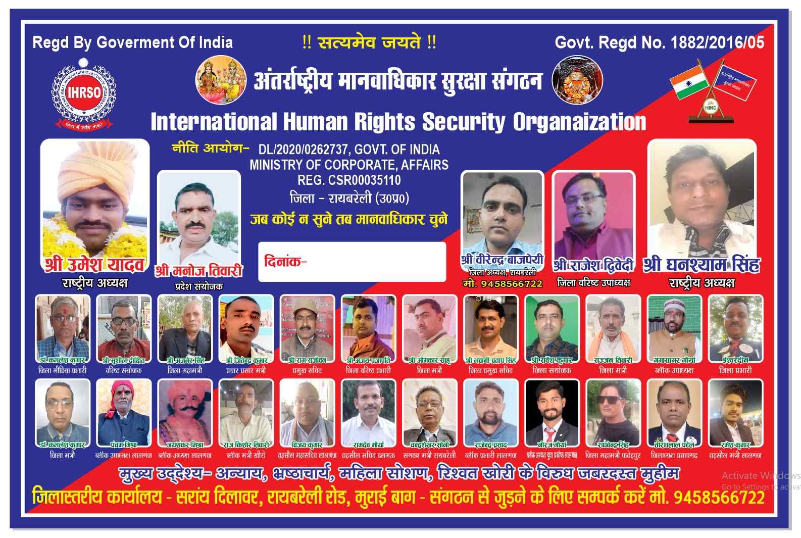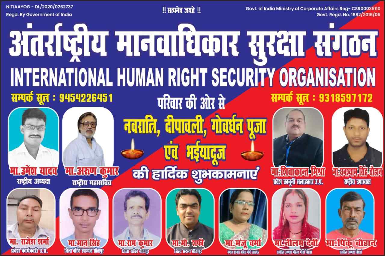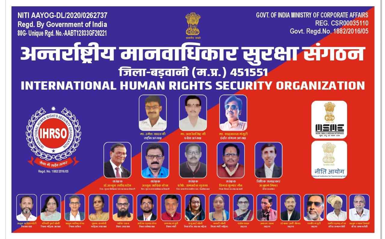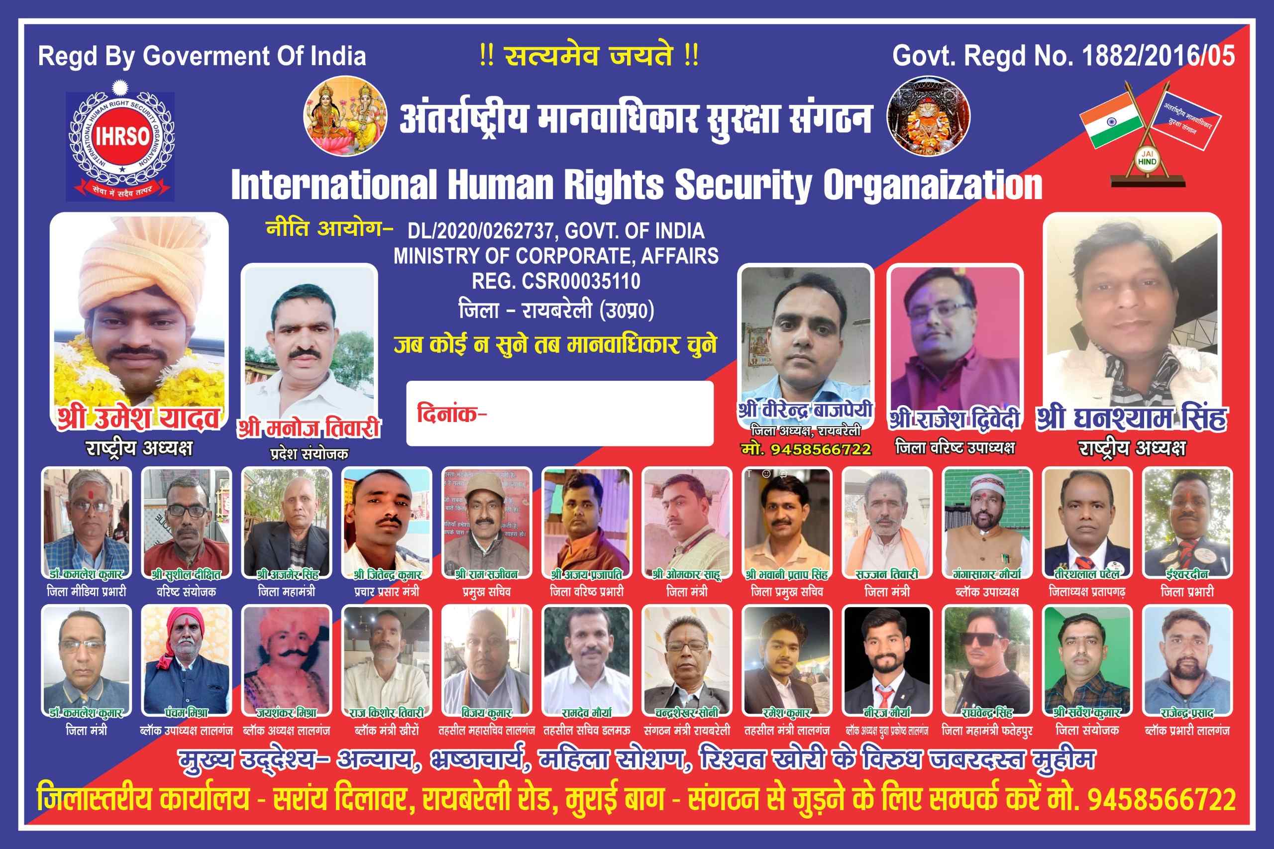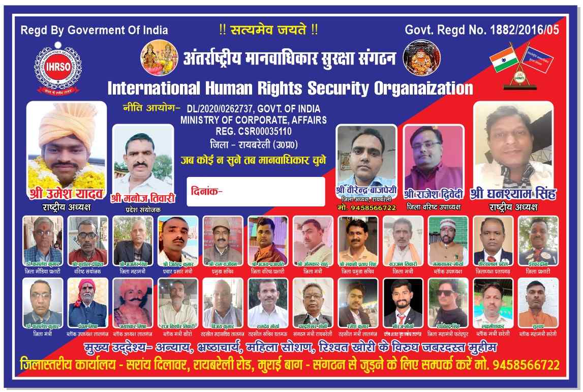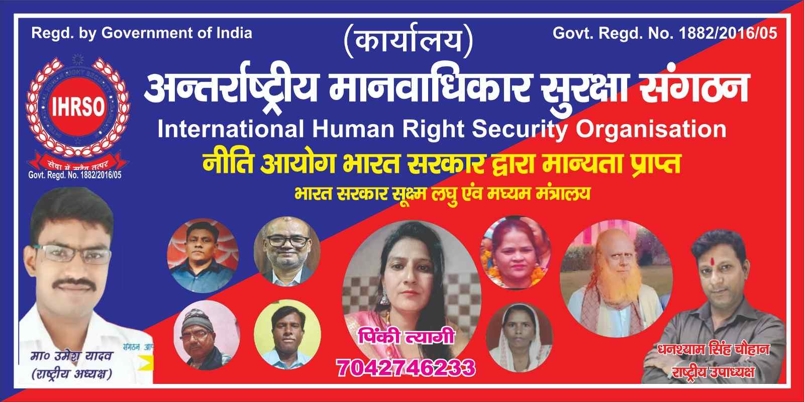 अंतर्राष्ट्रीय मानवाधिकार सुरक्षा संगठन 4 जनवरी वर्ष 2016 को उमेश यादव व घनश्याम सिंह व सीता यादव के द्वारा संगठन की स्थापना की गई है वर्ष 2016 से लगातार संगठन समाज हित मानव हित में काम कर रहा है जैसे मानव हनन जैसे मुद्दों पर लगातार कार्यरत है भ्रष्टाचार, महिला शोषण, रिश्वतखोरी, शिक्षा के लिए बच्चों को प्रेरित करना, बच्चों को निशुल्क शिक्षा प्रदान करना, गरीबों को कंबल वितरण करना, विधवा महिलाओं को साड़ी वितरण करना, मास्क वितरण करना, स्कूली बच्चों को कॉपी पेन किताब वितरण करना, वृद्धा आश्रम बनवाना, अनाथालय बनवाना आदि मुद्दों पर कार्यरत है संगठन भारत के 24 राज्यों में कार्य कर रहा है अंतर्राष्ट्रीय स्तर पर 3 देशों में कार्य कर रहा है नेपाल अमेरिका इटली प्रत्येक कार्यकर्ता मानव हित में समाज हित में कार्य कर रहा है और करता रहेगा