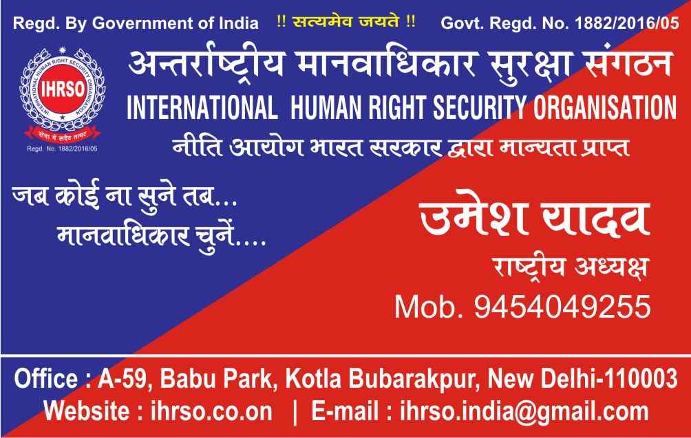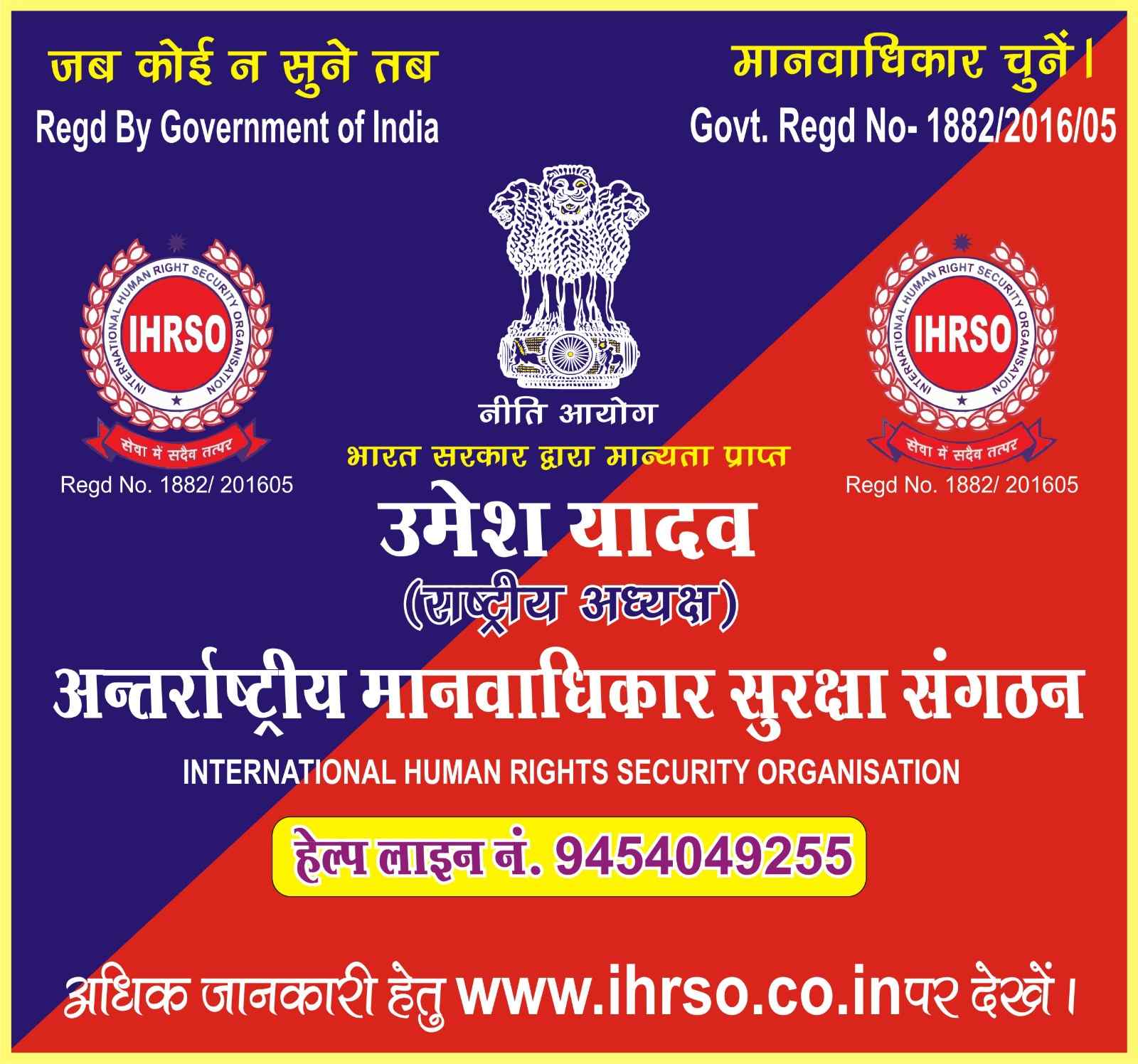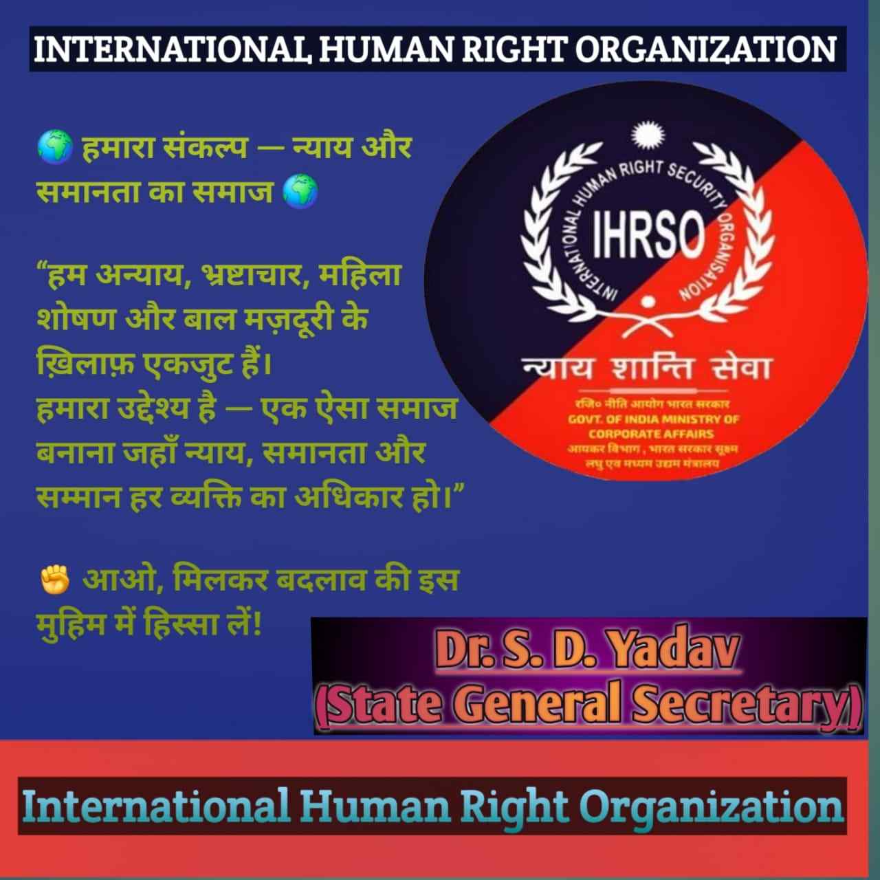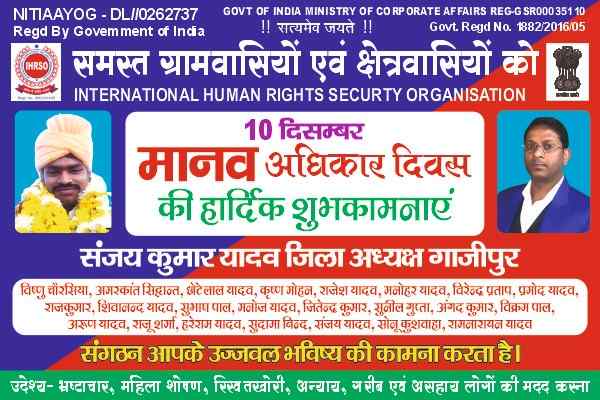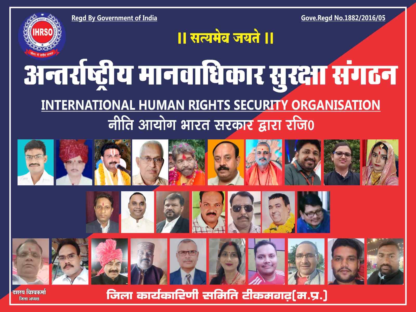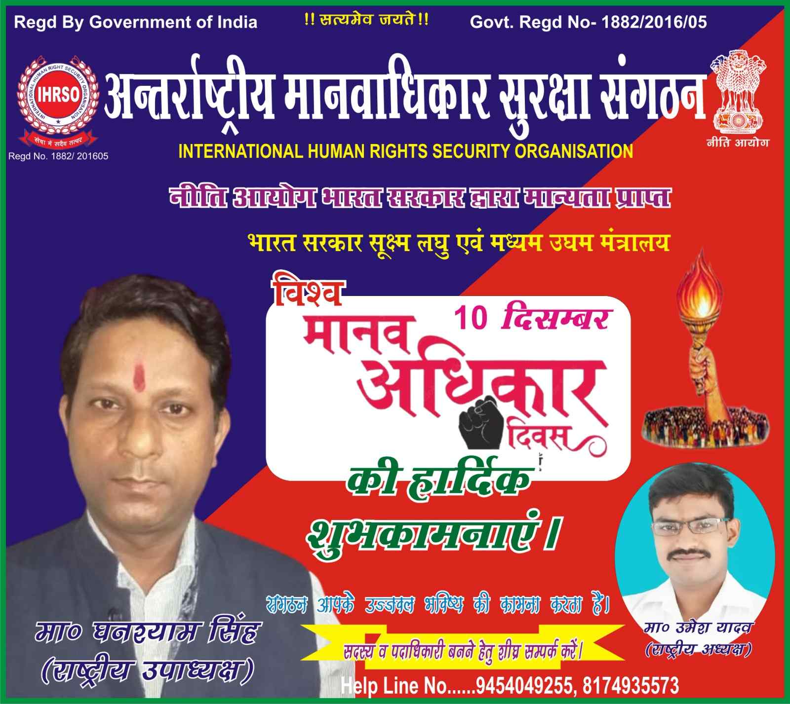 अंतर्राष्ट्रीय मानवाधिकार सुरक्षा संगठन 4 जनवरी वर्ष 2016 को उमेश यादव व घनश्याम सिंह व सीता यादव के द्वारा संगठन की स्थापना की गई है वर्ष 2016 से लगातार संगठन समाज हित मानव हित में काम कर रहा है जैसे मानव हनन जैसे मुद्दों पर लगातार कार्यरत है भ्रष्टाचार, महिला शोषण, रिश्वतखोरी, शिक्षा के लिए बच्चों को प्रेरित करना, बच्चों को निशुल्क शिक्षा प्रदान करना, गरीबों को कंबल वितरण करना, विधवा महिलाओं को साड़ी वितरण करना, मास्क वितरण करना, स्कूली बच्चों को कॉपी पेन किताब वितरण करना, वृद्धा आश्रम बनवाना, अनाथालय बनवाना आदि मुद्दों पर कार्यरत है संगठन भारत के 24 राज्यों में कार्य कर रहा है अंतर्राष्ट्रीय स्तर पर 3 देशों में कार्य कर रहा है नेपाल अमेरिका इटली प्रत्येक कार्यकर्ता मानव हित में समाज हित में कार्य कर रहा है और करता रहेगा