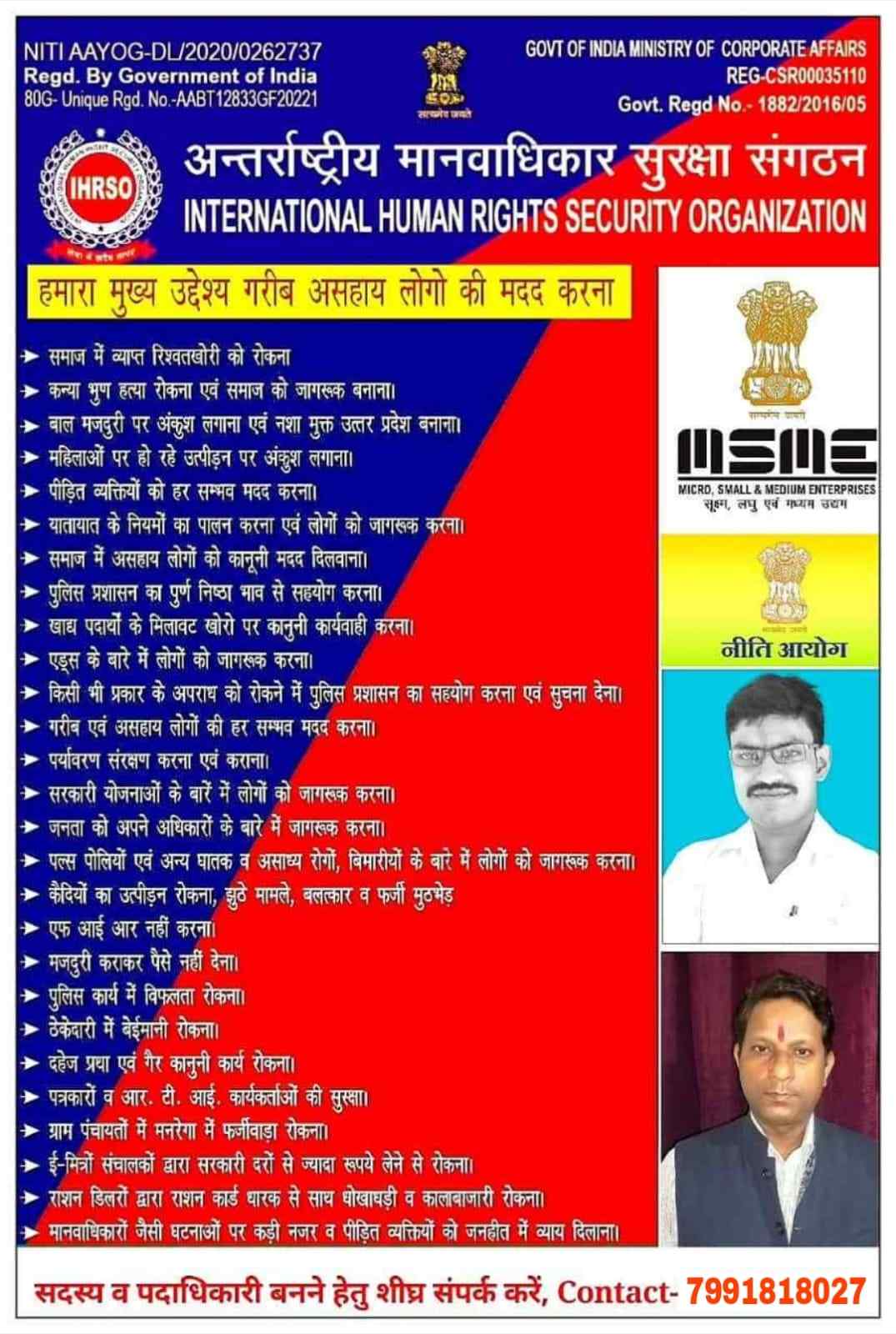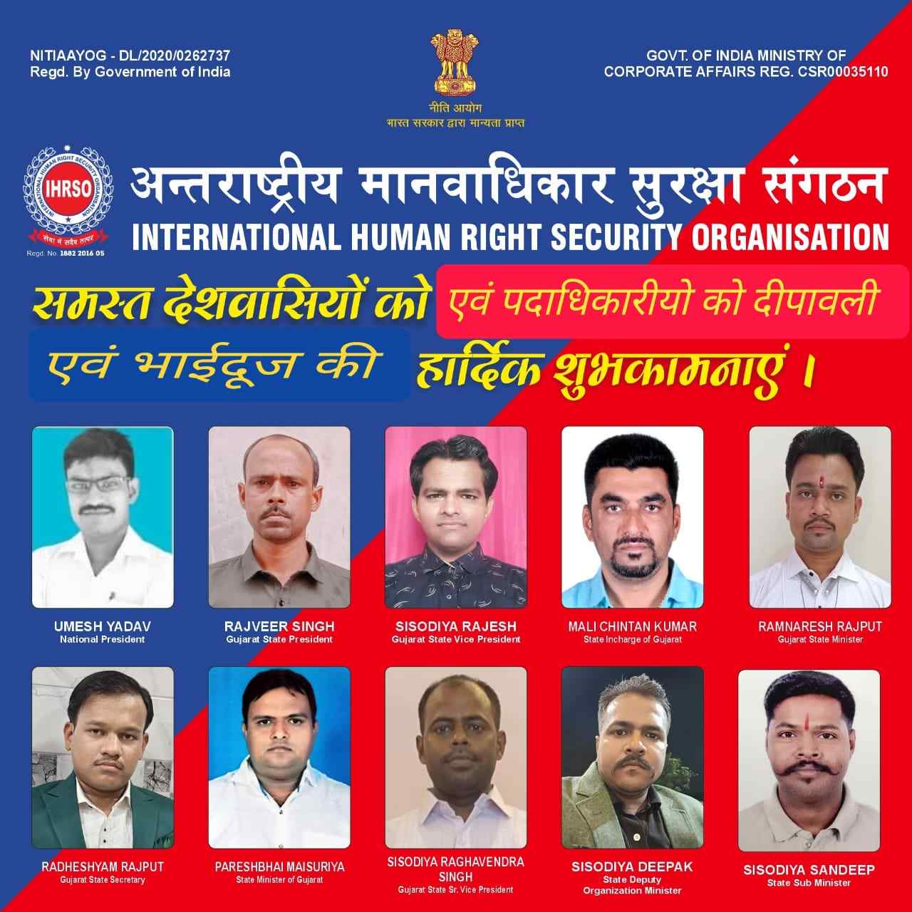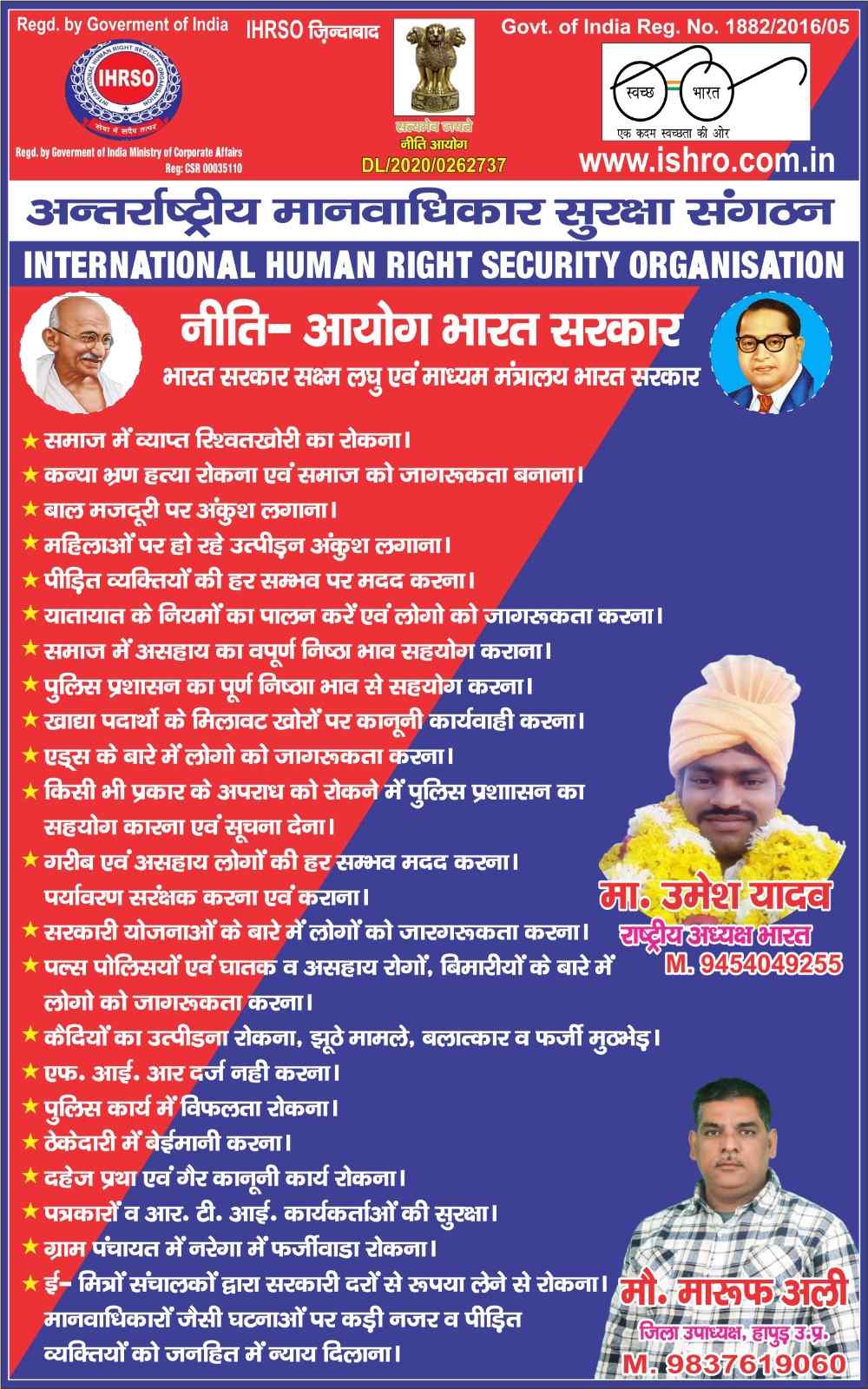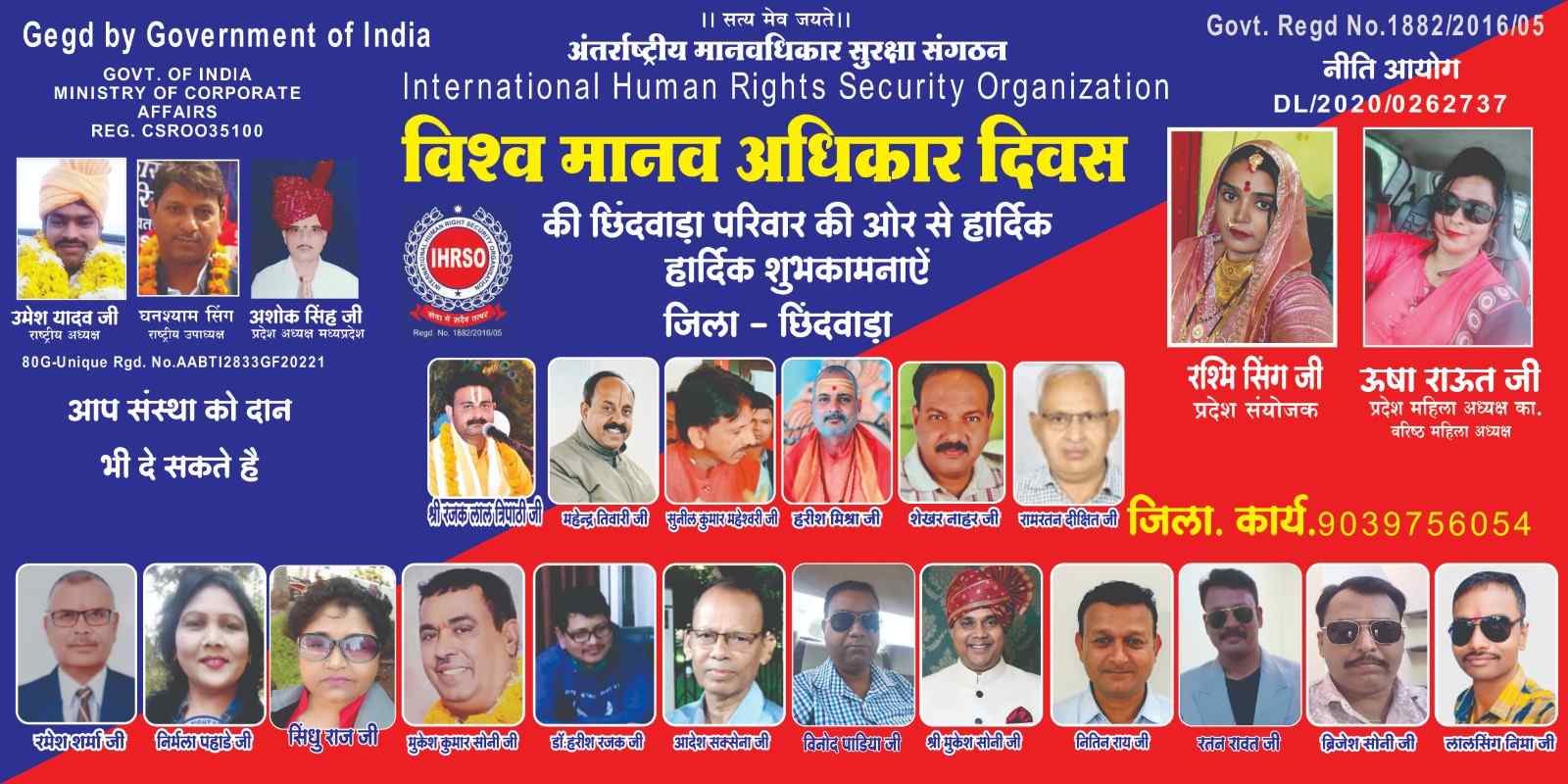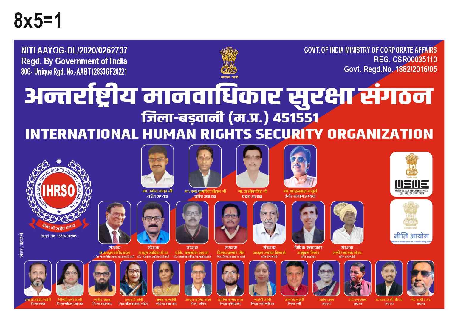 अंतर्राष्ट्रीय मानवाधिकार सुरक्षा संगठन 4 जनवरी वर्ष 2016 को उमेश यादव व घनश्याम सिंह व सीता यादव के द्वारा संगठन की स्थापना की गई है वर्ष 2016 से लगातार संगठन समाज हित मानव हित में काम कर रहा है जैसे मानव हनन जैसे मुद्दों पर लगातार कार्यरत है भ्रष्टाचार, महिला शोषण, रिश्वतखोरी, शिक्षा के लिए बच्चों को प्रेरित करना, बच्चों को निशुल्क शिक्षा प्रदान करना, गरीबों को कंबल वितरण करना, विधवा महिलाओं को साड़ी वितरण करना, मास्क वितरण करना, स्कूली बच्चों को कॉपी पेन किताब वितरण करना, वृद्धा आश्रम बनवाना, अनाथालय बनवाना आदि मुद्दों पर कार्यरत है संगठन भारत के 24 राज्यों में कार्य कर रहा है अंतर्राष्ट्रीय स्तर पर 3 देशों में कार्य कर रहा है नेपाल अमेरिका इटली प्रत्येक कार्यकर्ता मानव हित में समाज हित में कार्य कर रहा है और करता रहेगा
