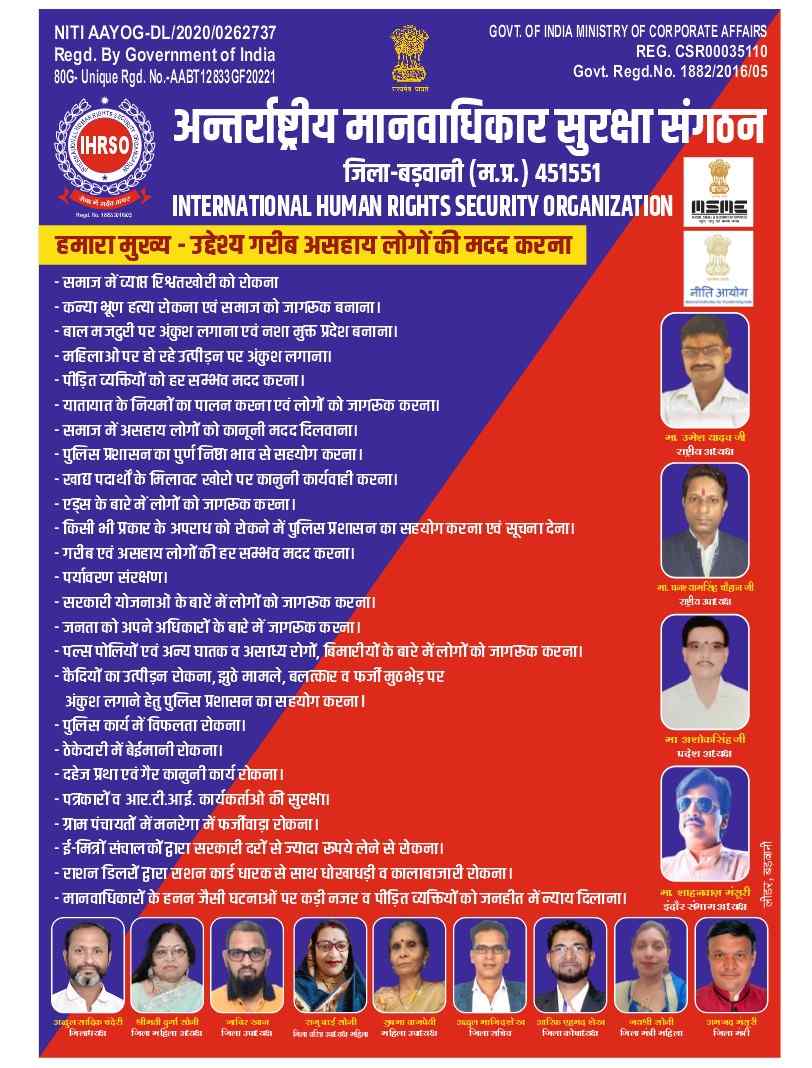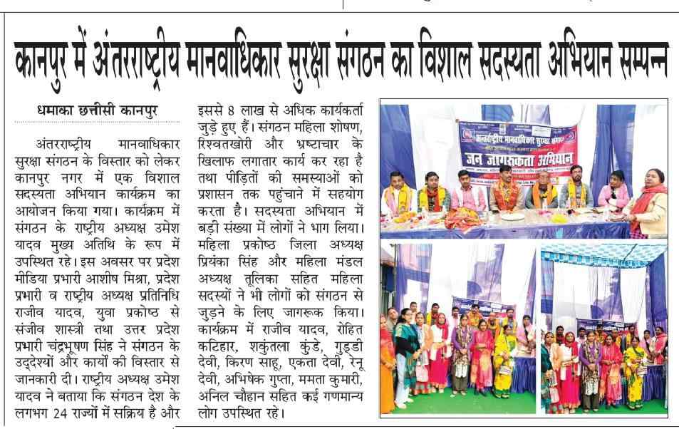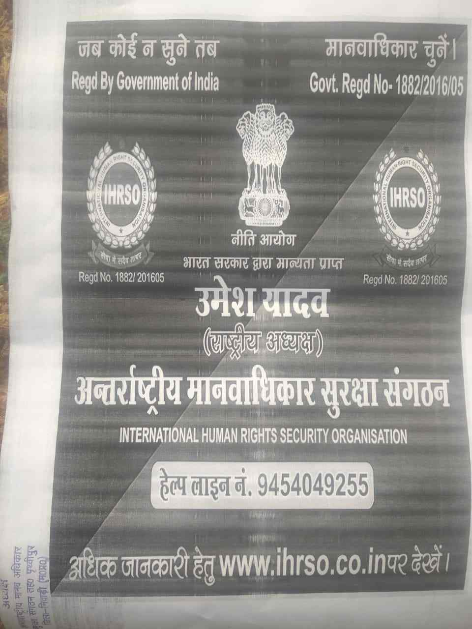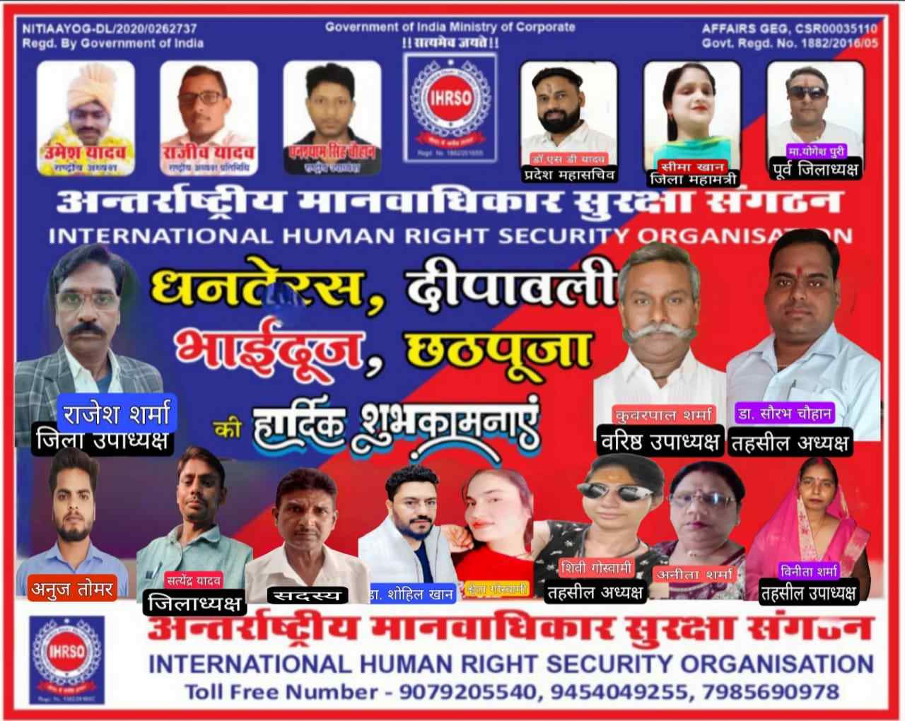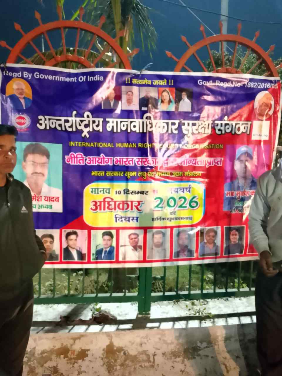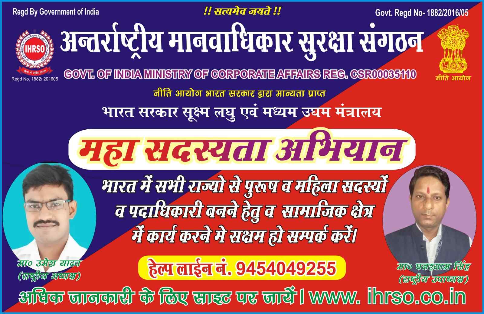अंतर्राष्ट्रीय मानवाधिकार सुरक्षा संगठन 4 जनवरी वर्ष 2016 को उमेश यादव व घनश्याम सिंह व सीता यादव के द्वारा संगठन की स्थापना की गई है वर्ष 2016 से लगातार संगठन समाज हित मानव हित में काम कर रहा है जैसे मानव हनन जैसे मुद्दों पर लगातार कार्यरत है भ्रष्टाचार, महिला शोषण, रिश्वतखोरी, शिक्षा के लिए बच्चों को प्रेरित करना, बच्चों को निशुल्क शिक्षा प्रदान करना, गरीबों को कंबल वितरण करना, विधवा महिलाओं को साड़ी वितरण करना, मास्क वितरण करना, स्कूली बच्चों को कॉपी पेन किताब वितरण करना, वृद्धा आश्रम बनवाना, अनाथालय बनवाना आदि मुद्दों पर कार्यरत है संगठन भारत के 24 राज्यों में कार्य कर रहा है अंतर्राष्ट्रीय स्तर पर 3 देशों में कार्य कर रहा है नेपाल अमेरिका इटली प्रत्येक कार्यकर्ता मानव हित में समाज हित में कार्य कर रहा है और करता रहेगा