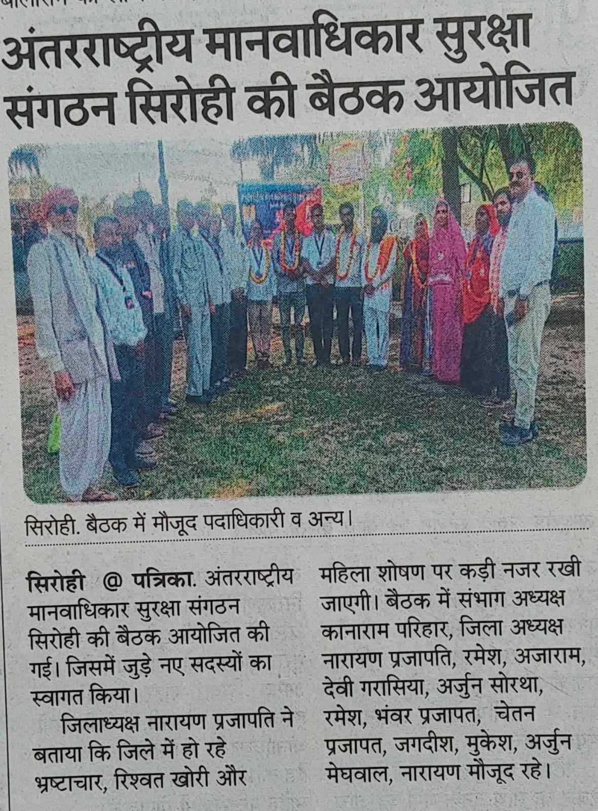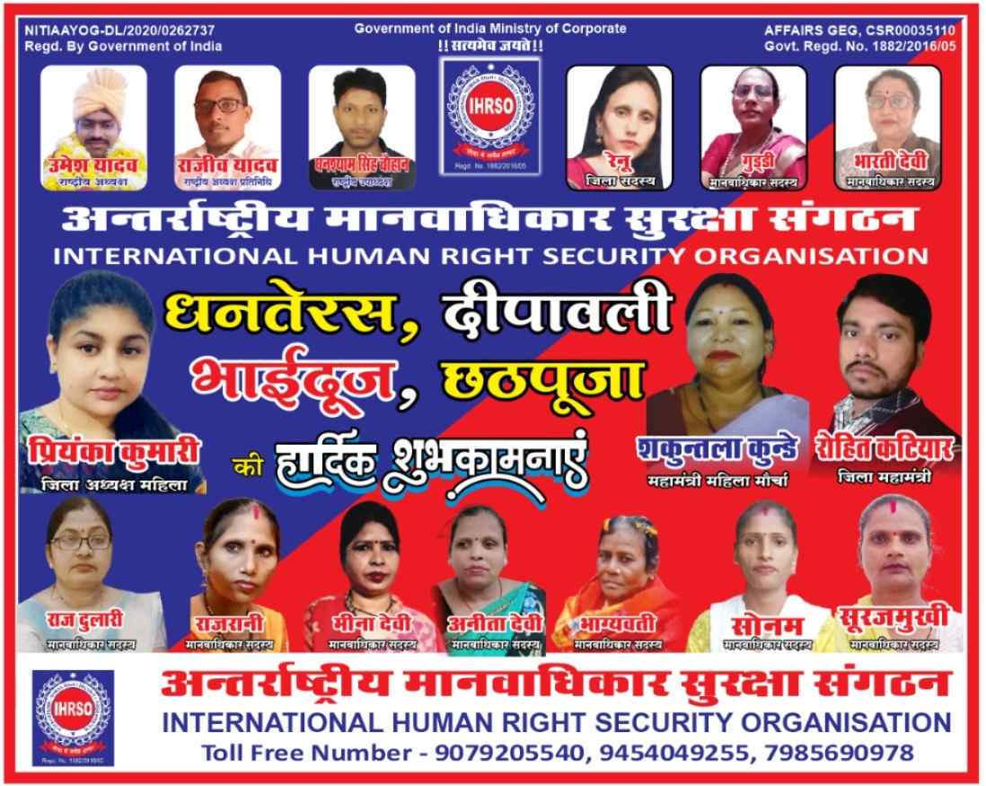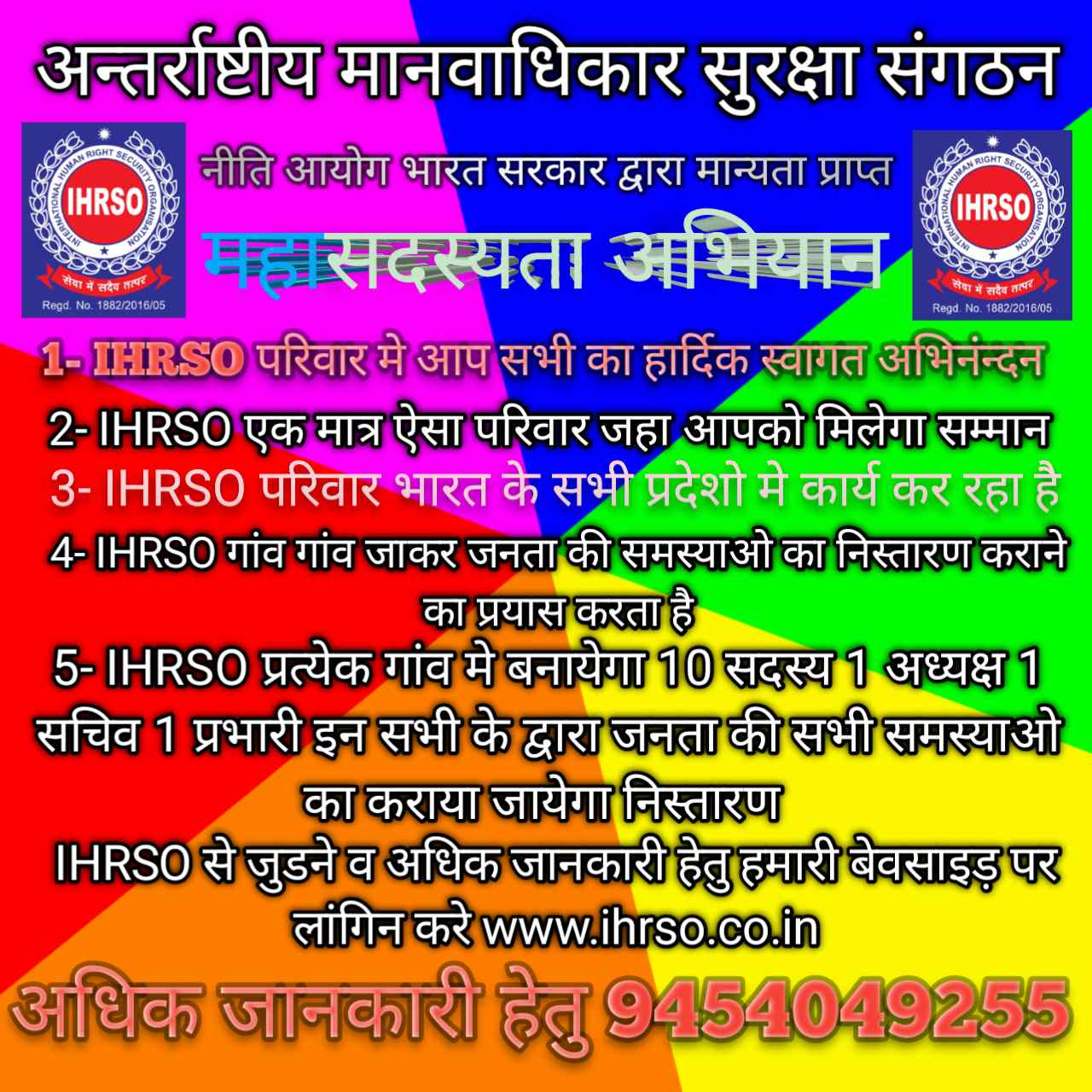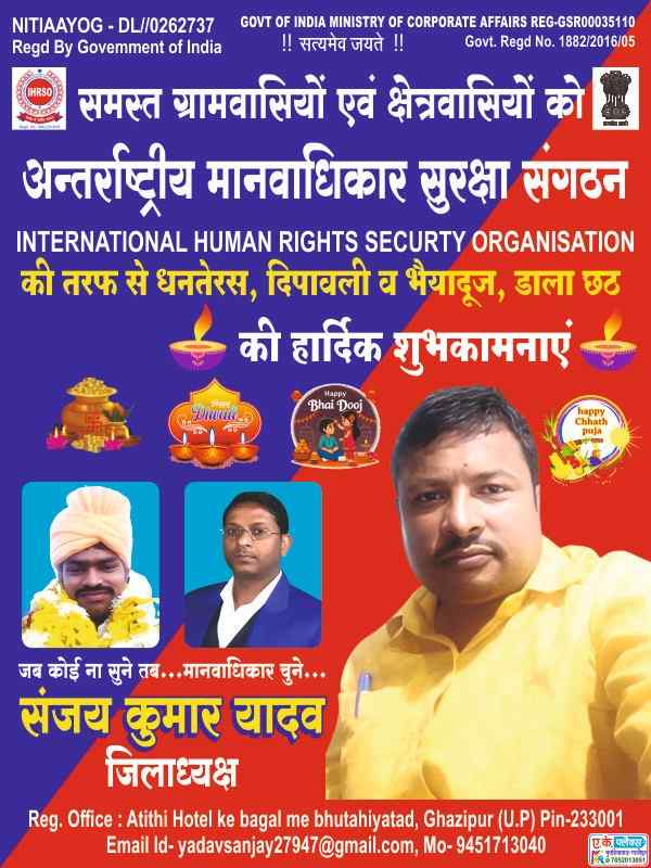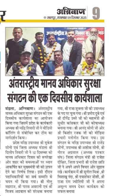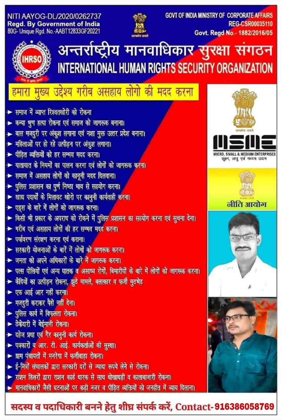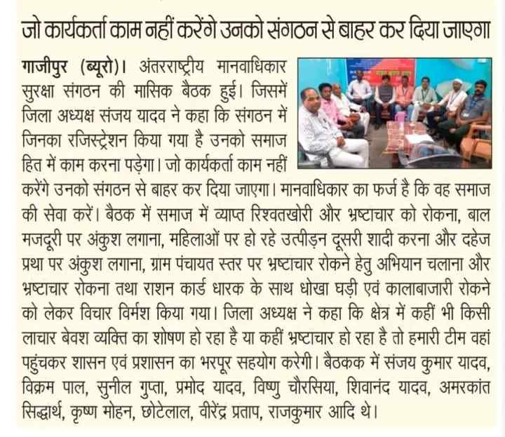 अंतर्राष्ट्रीय मानवाधिकार सुरक्षा संगठन 4 जनवरी वर्ष 2016 को उमेश यादव व घनश्याम सिंह व सीता यादव के द्वारा संगठन की स्थापना की गई है वर्ष 2016 से लगातार संगठन समाज हित मानव हित में काम कर रहा है जैसे मानव हनन जैसे मुद्दों पर लगातार कार्यरत है भ्रष्टाचार, महिला शोषण, रिश्वतखोरी, शिक्षा के लिए बच्चों को प्रेरित करना, बच्चों को निशुल्क शिक्षा प्रदान करना, गरीबों को कंबल वितरण करना, विधवा महिलाओं को साड़ी वितरण करना, मास्क वितरण करना, स्कूली बच्चों को कॉपी पेन किताब वितरण करना, वृद्धा आश्रम बनवाना, अनाथालय बनवाना आदि मुद्दों पर कार्यरत है संगठन भारत के 24 राज्यों में कार्य कर रहा है अंतर्राष्ट्रीय स्तर पर 3 देशों में कार्य कर रहा है नेपाल अमेरिका इटली प्रत्येक कार्यकर्ता मानव हित में समाज हित में कार्य कर रहा है और करता रहेगा