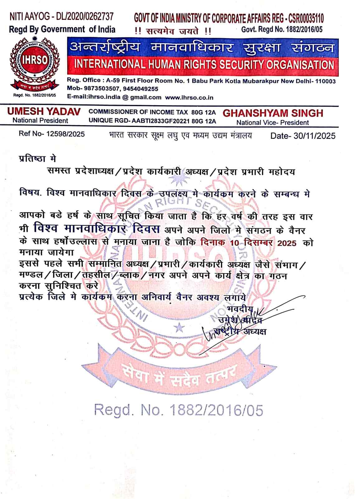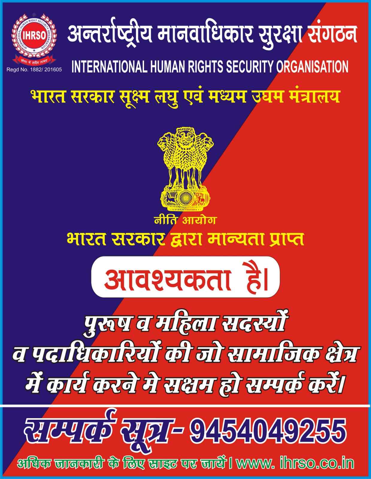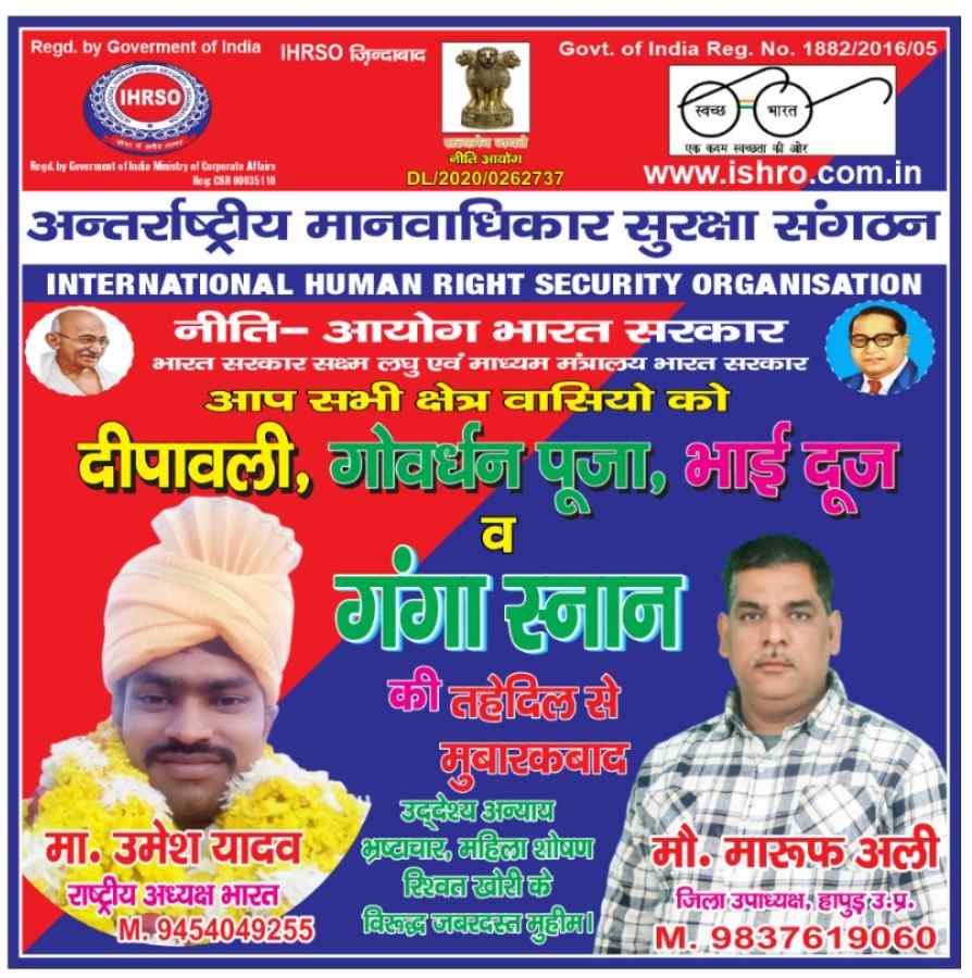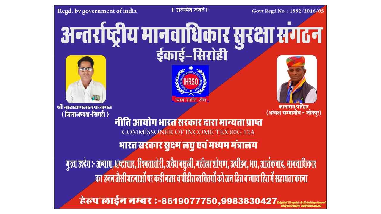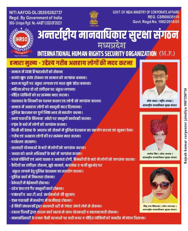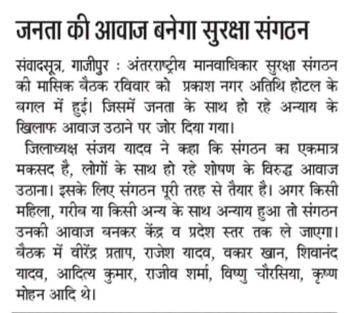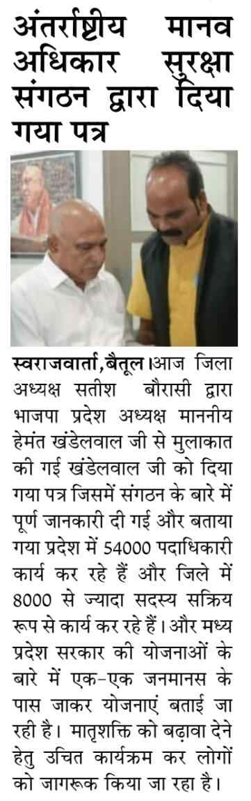 अंतर्राष्ट्रीय मानवाधिकार सुरक्षा संगठन 4 जनवरी वर्ष 2016 को उमेश यादव व घनश्याम सिंह व सीता यादव के द्वारा संगठन की स्थापना की गई है वर्ष 2016 से लगातार संगठन समाज हित मानव हित में काम कर रहा है जैसे मानव हनन जैसे मुद्दों पर लगातार कार्यरत है भ्रष्टाचार, महिला शोषण, रिश्वतखोरी, शिक्षा के लिए बच्चों को प्रेरित करना, बच्चों को निशुल्क शिक्षा प्रदान करना, गरीबों को कंबल वितरण करना, विधवा महिलाओं को साड़ी वितरण करना, मास्क वितरण करना, स्कूली बच्चों को कॉपी पेन किताब वितरण करना, वृद्धा आश्रम बनवाना, अनाथालय बनवाना आदि मुद्दों पर कार्यरत है संगठन भारत के 24 राज्यों में कार्य कर रहा है अंतर्राष्ट्रीय स्तर पर 3 देशों में कार्य कर रहा है नेपाल अमेरिका इटली प्रत्येक कार्यकर्ता मानव हित में समाज हित में कार्य कर रहा है और करता रहेगा
