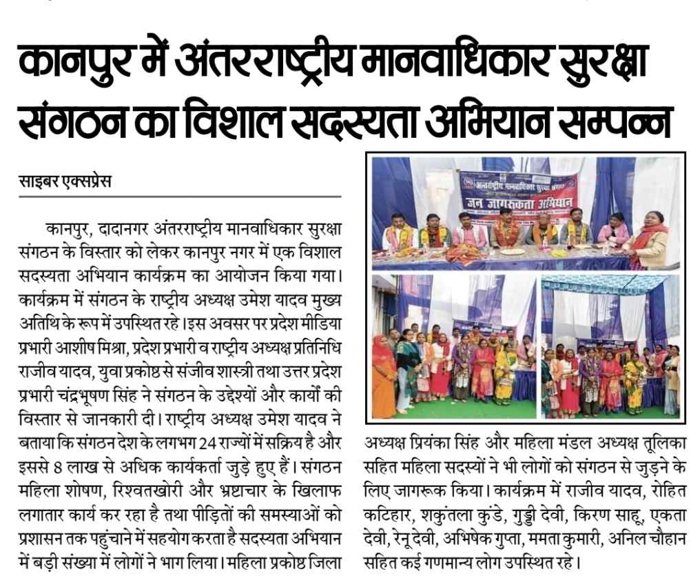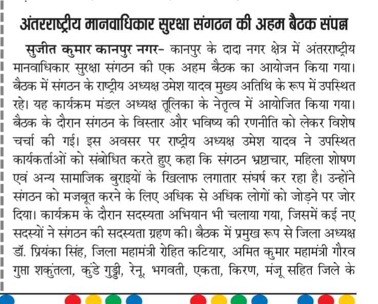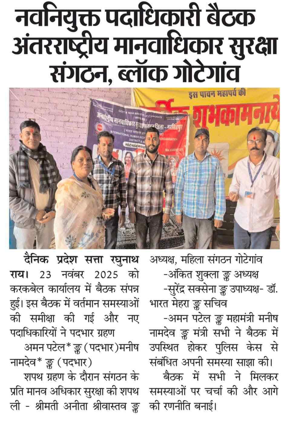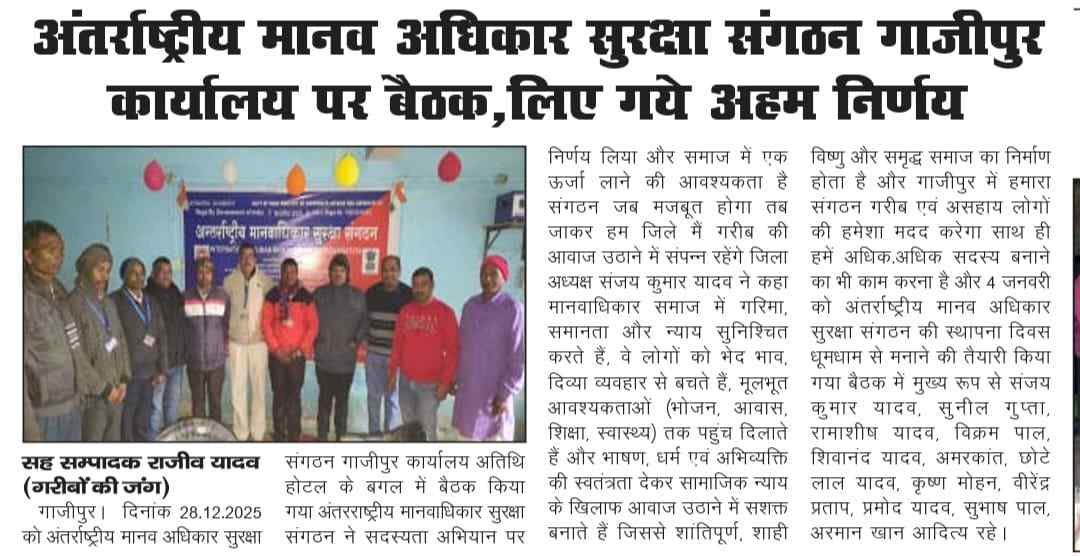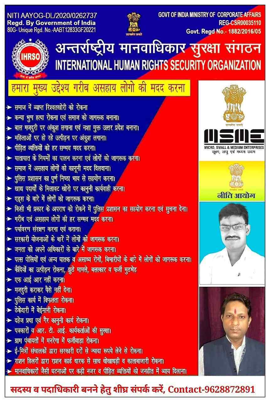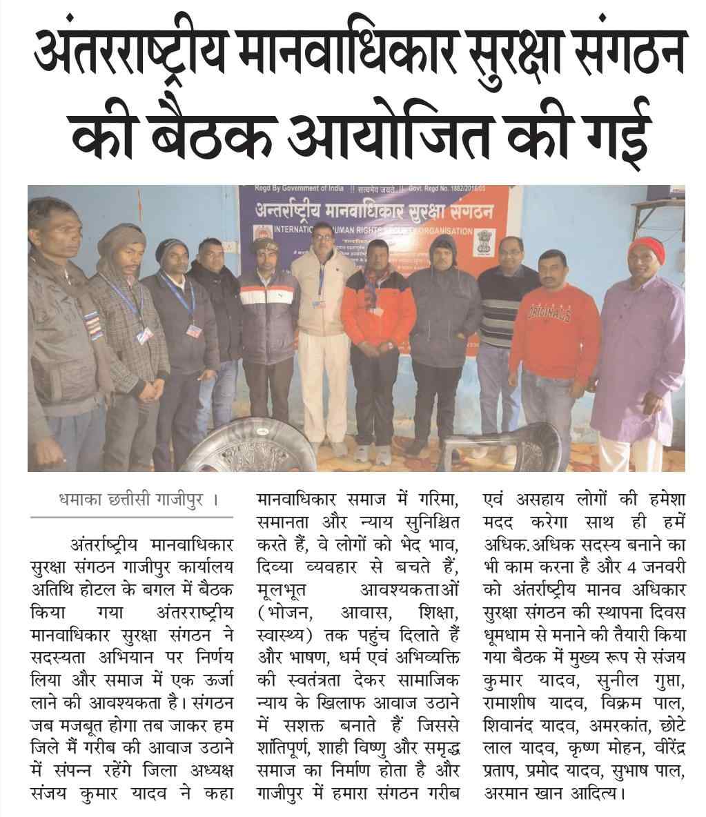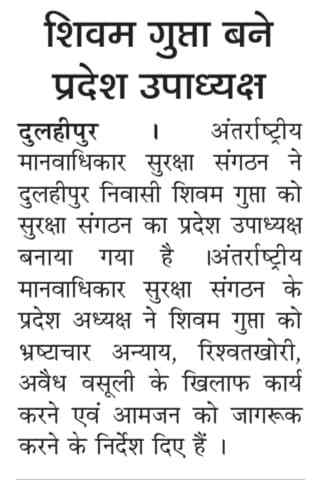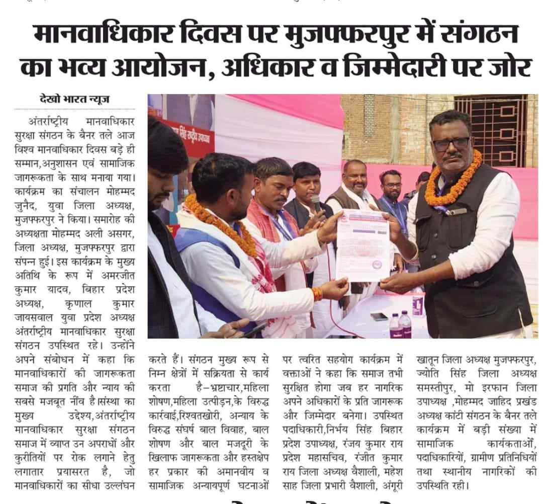 अंतर्राष्ट्रीय मानवाधिकार सुरक्षा संगठन 4 जनवरी वर्ष 2016 को उमेश यादव व घनश्याम सिंह व सीता यादव के द्वारा संगठन की स्थापना की गई है वर्ष 2016 से लगातार संगठन समाज हित मानव हित में काम कर रहा है जैसे मानव हनन जैसे मुद्दों पर लगातार कार्यरत है भ्रष्टाचार, महिला शोषण, रिश्वतखोरी, शिक्षा के लिए बच्चों को प्रेरित करना, बच्चों को निशुल्क शिक्षा प्रदान करना, गरीबों को कंबल वितरण करना, विधवा महिलाओं को साड़ी वितरण करना, मास्क वितरण करना, स्कूली बच्चों को कॉपी पेन किताब वितरण करना, वृद्धा आश्रम बनवाना, अनाथालय बनवाना आदि मुद्दों पर कार्यरत है संगठन भारत के 24 राज्यों में कार्य कर रहा है अंतर्राष्ट्रीय स्तर पर 3 देशों में कार्य कर रहा है नेपाल अमेरिका इटली प्रत्येक कार्यकर्ता मानव हित में समाज हित में कार्य कर रहा है और करता रहेगा