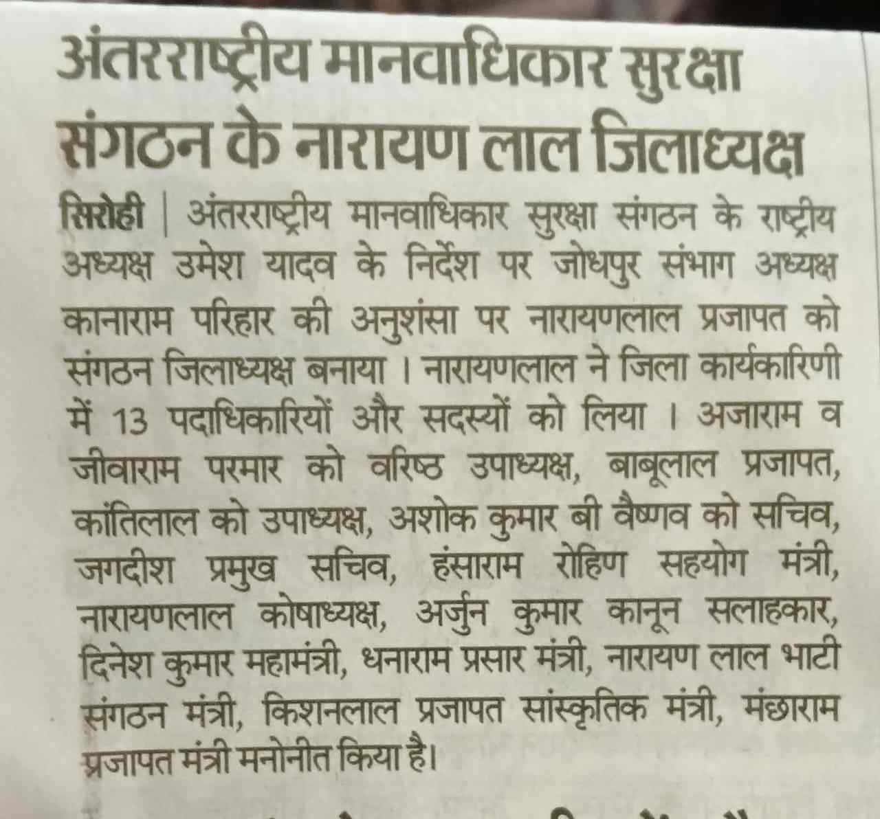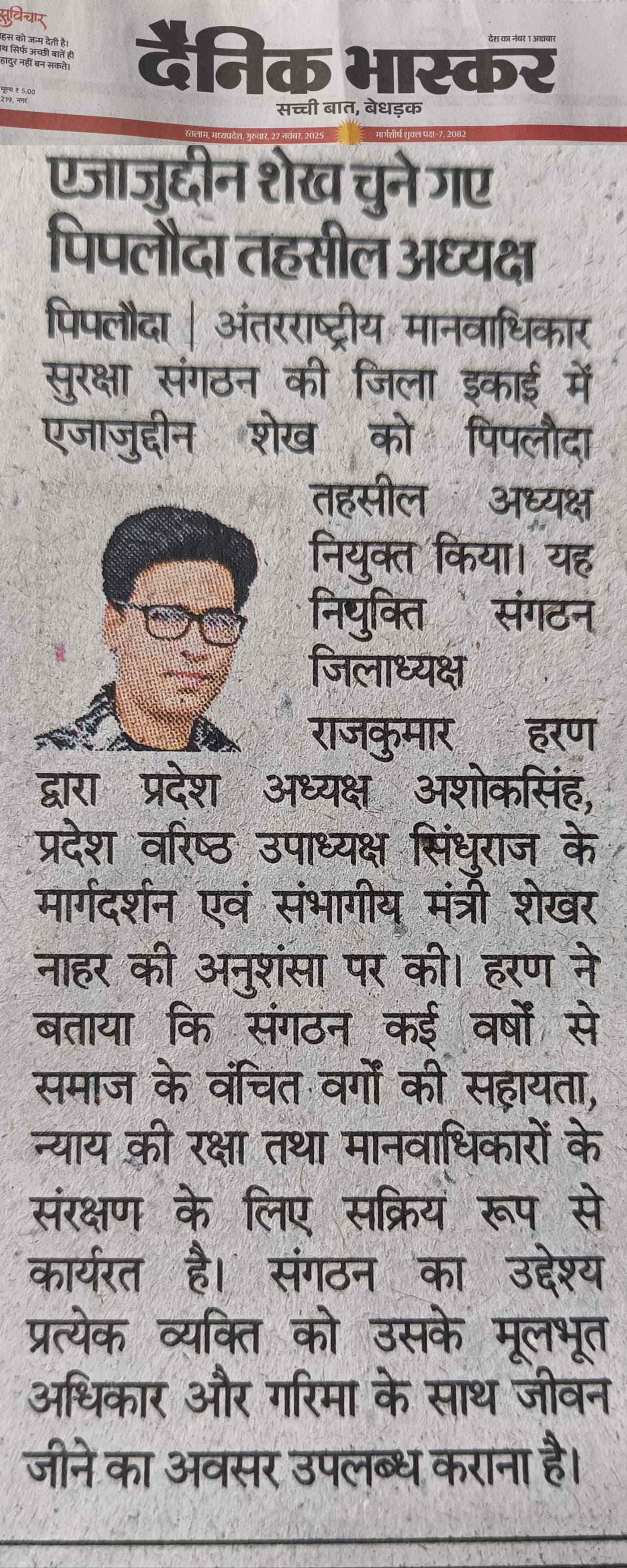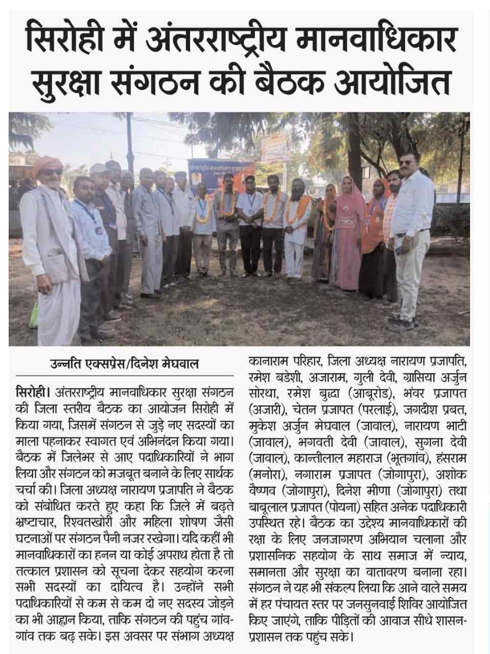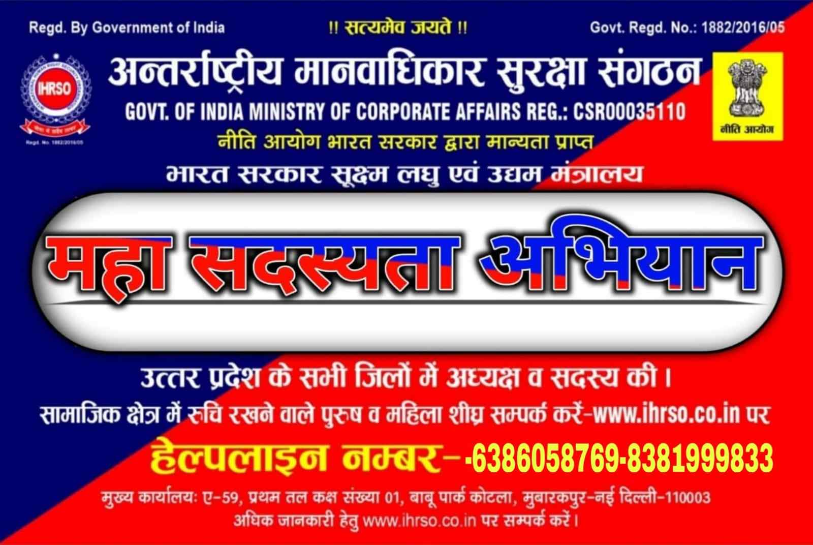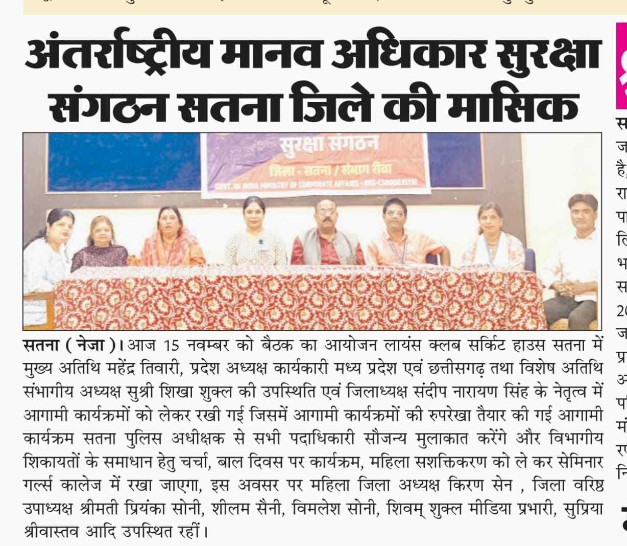 अंतर्राष्ट्रीय मानवाधिकार सुरक्षा संगठन 4 जनवरी वर्ष 2016 को उमेश यादव व घनश्याम सिंह व सीता यादव के द्वारा संगठन की स्थापना की गई है वर्ष 2016 से लगातार संगठन समाज हित मानव हित में काम कर रहा है जैसे मानव हनन जैसे मुद्दों पर लगातार कार्यरत है भ्रष्टाचार, महिला शोषण, रिश्वतखोरी, शिक्षा के लिए बच्चों को प्रेरित करना, बच्चों को निशुल्क शिक्षा प्रदान करना, गरीबों को कंबल वितरण करना, विधवा महिलाओं को साड़ी वितरण करना, मास्क वितरण करना, स्कूली बच्चों को कॉपी पेन किताब वितरण करना, वृद्धा आश्रम बनवाना, अनाथालय बनवाना आदि मुद्दों पर कार्यरत है संगठन भारत के 24 राज्यों में कार्य कर रहा है अंतर्राष्ट्रीय स्तर पर 3 देशों में कार्य कर रहा है नेपाल अमेरिका इटली प्रत्येक कार्यकर्ता मानव हित में समाज हित में कार्य कर रहा है और करता रहेगा