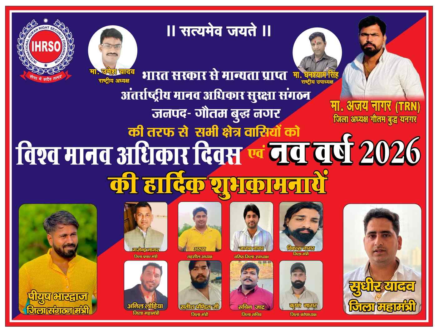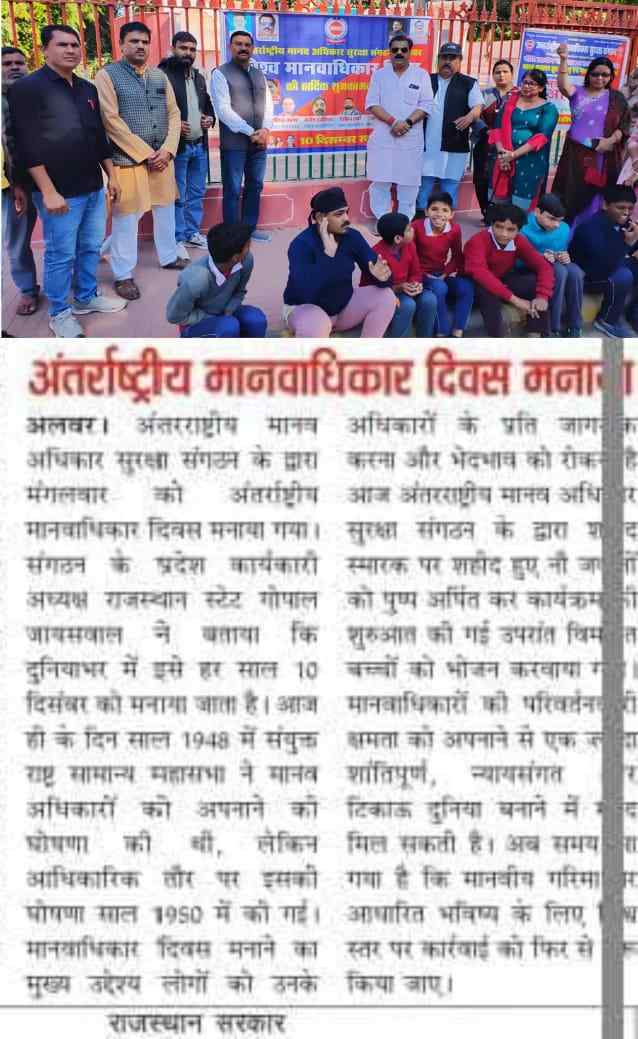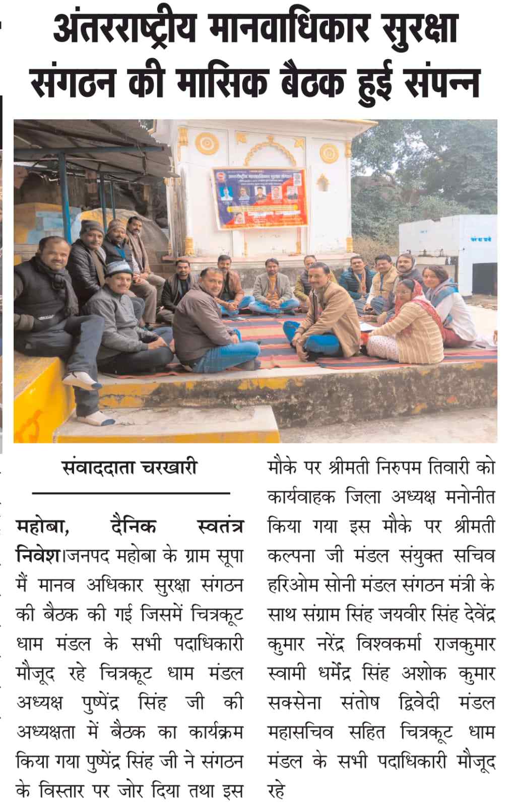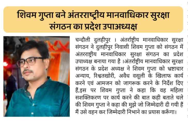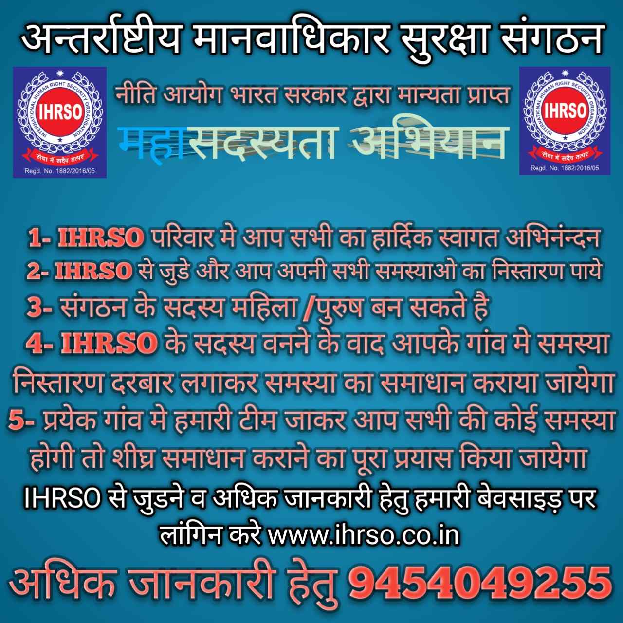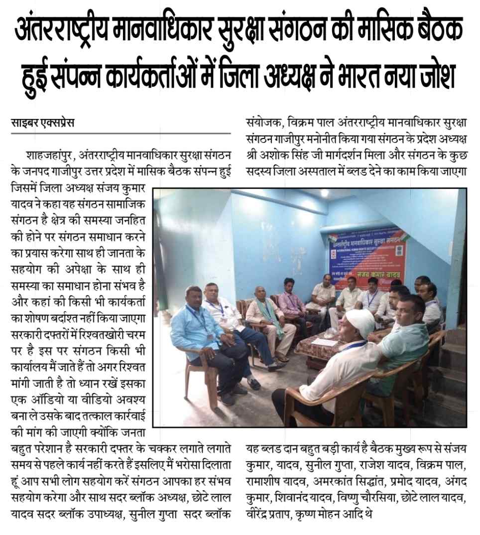 अंतर्राष्ट्रीय मानवाधिकार सुरक्षा संगठन 4 जनवरी वर्ष 2016 को उमेश यादव व घनश्याम सिंह व सीता यादव के द्वारा संगठन की स्थापना की गई है वर्ष 2016 से लगातार संगठन समाज हित मानव हित में काम कर रहा है जैसे मानव हनन जैसे मुद्दों पर लगातार कार्यरत है भ्रष्टाचार, महिला शोषण, रिश्वतखोरी, शिक्षा के लिए बच्चों को प्रेरित करना, बच्चों को निशुल्क शिक्षा प्रदान करना, गरीबों को कंबल वितरण करना, विधवा महिलाओं को साड़ी वितरण करना, मास्क वितरण करना, स्कूली बच्चों को कॉपी पेन किताब वितरण करना, वृद्धा आश्रम बनवाना, अनाथालय बनवाना आदि मुद्दों पर कार्यरत है संगठन भारत के 24 राज्यों में कार्य कर रहा है अंतर्राष्ट्रीय स्तर पर 3 देशों में कार्य कर रहा है नेपाल अमेरिका इटली प्रत्येक कार्यकर्ता मानव हित में समाज हित में कार्य कर रहा है और करता रहेगा