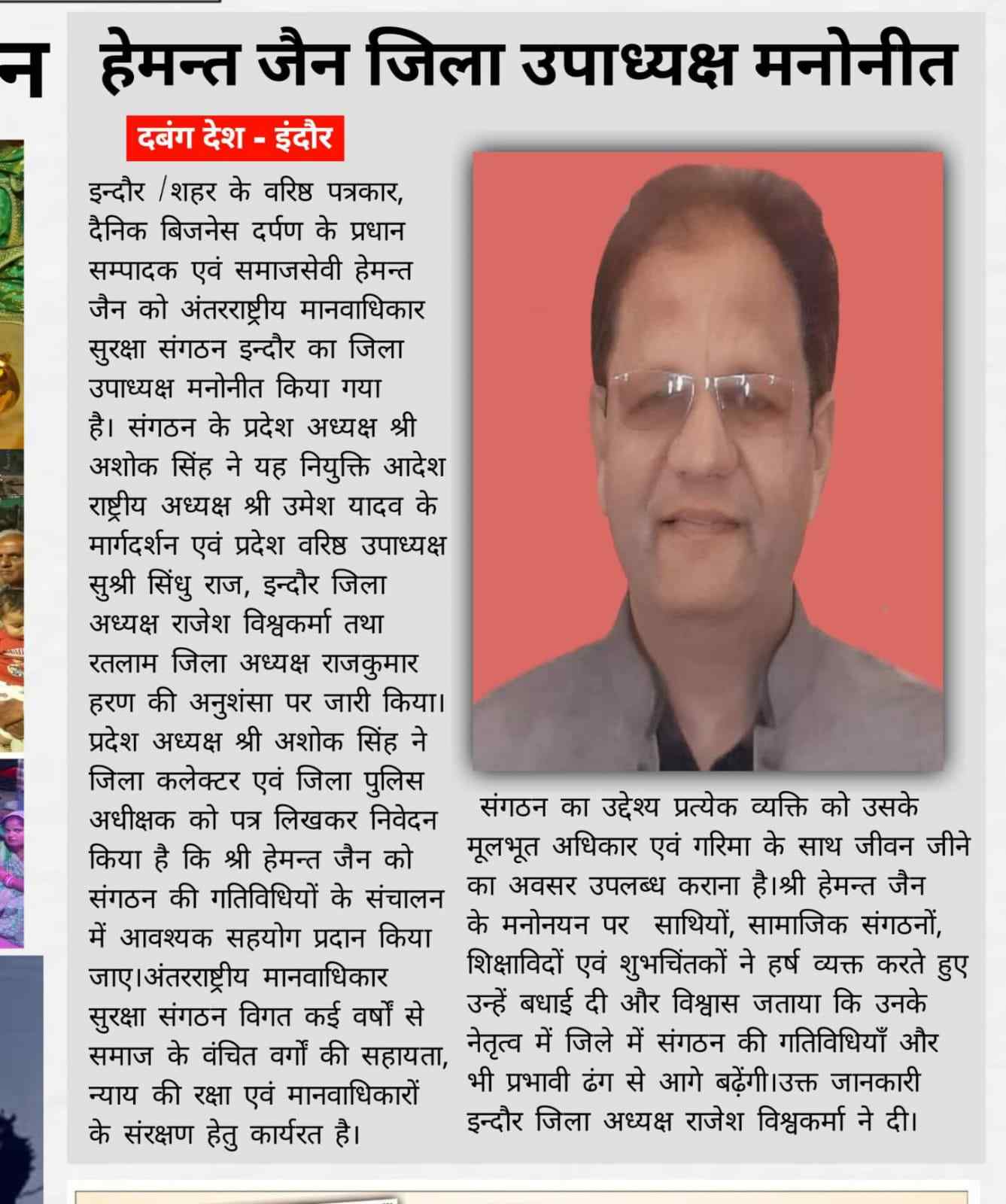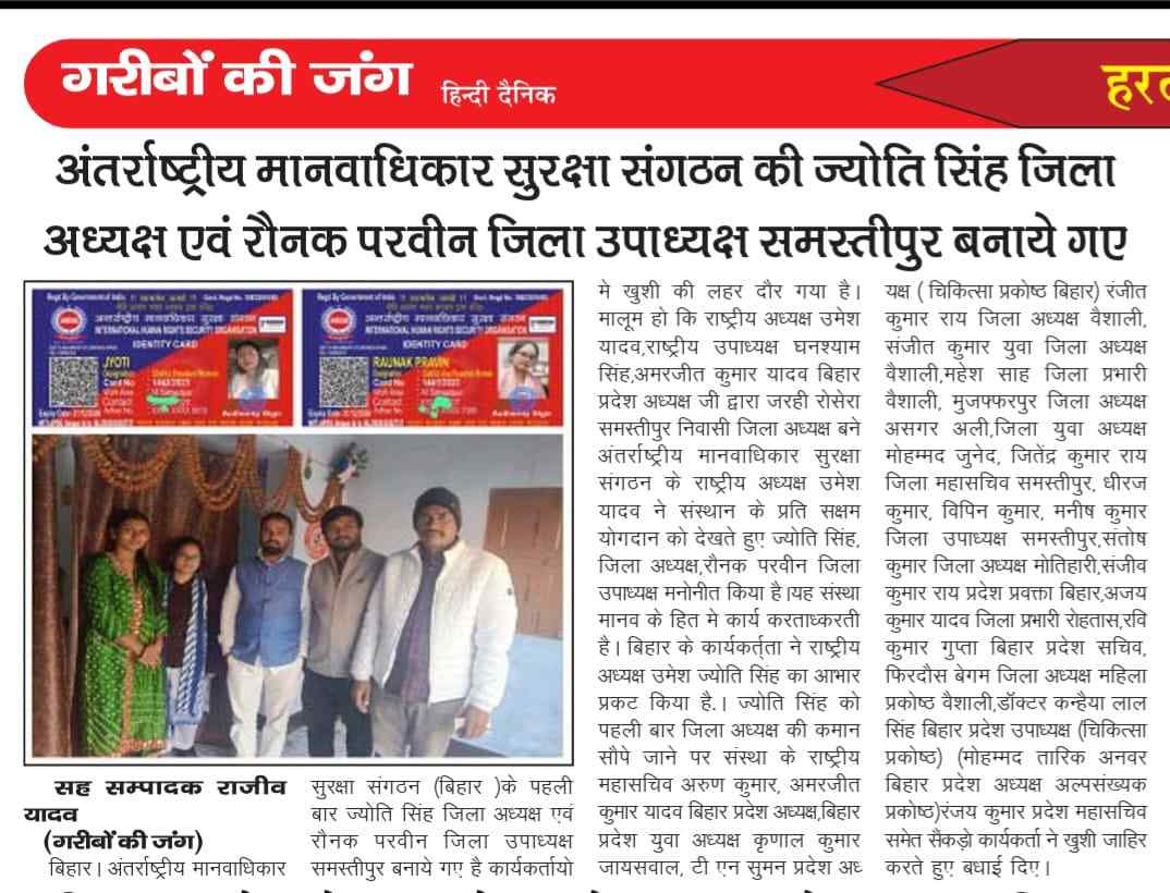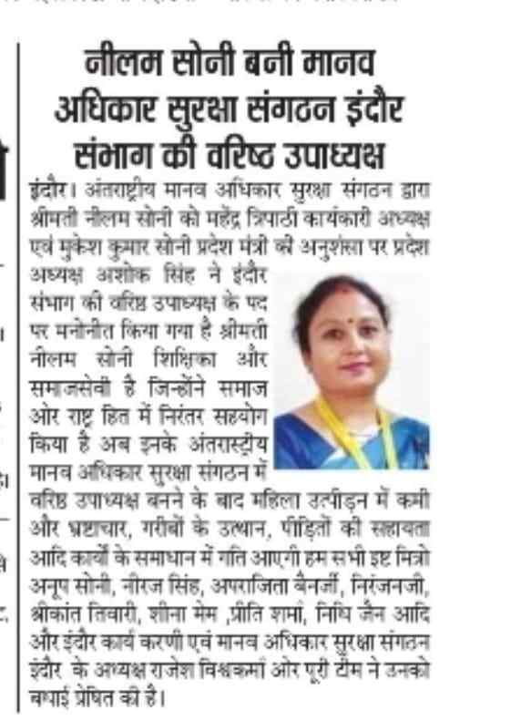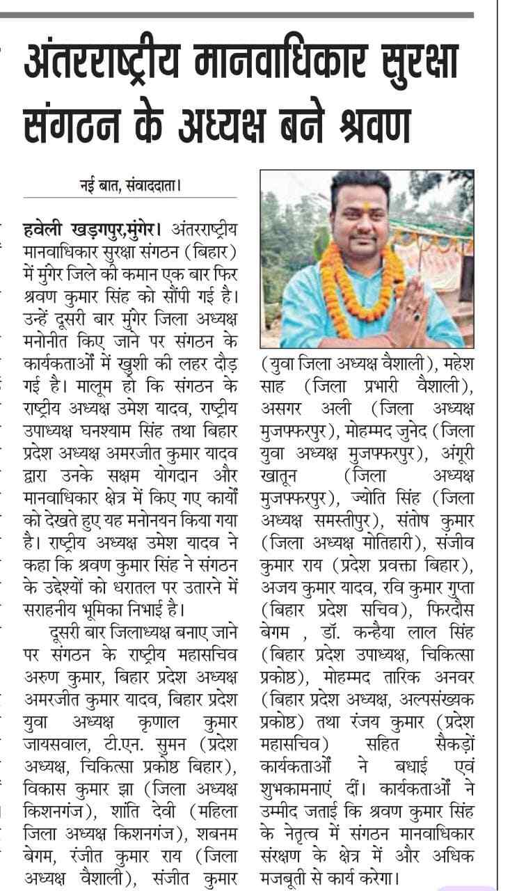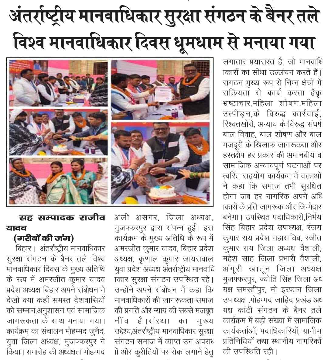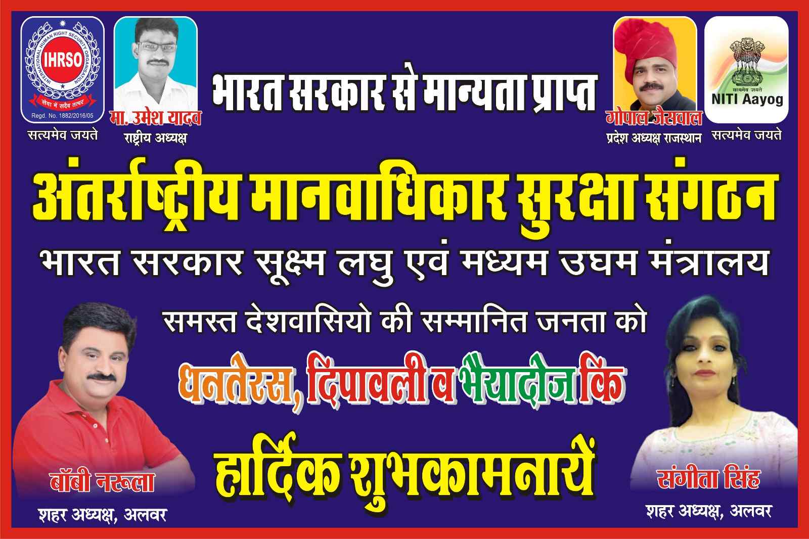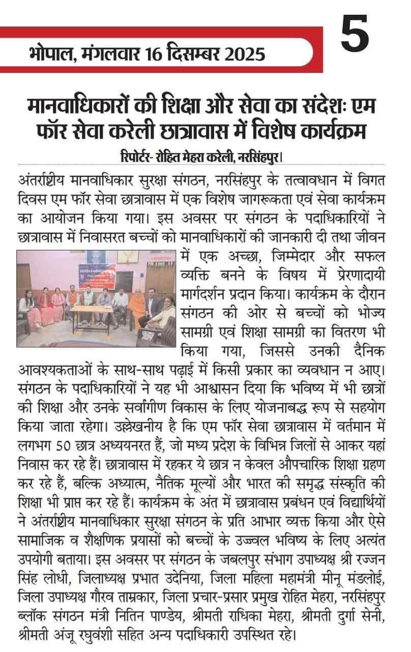 अंतर्राष्ट्रीय मानवाधिकार सुरक्षा संगठन 4 जनवरी वर्ष 2016 को उमेश यादव व घनश्याम सिंह व सीता यादव के द्वारा संगठन की स्थापना की गई है वर्ष 2016 से लगातार संगठन समाज हित मानव हित में काम कर रहा है जैसे मानव हनन जैसे मुद्दों पर लगातार कार्यरत है भ्रष्टाचार, महिला शोषण, रिश्वतखोरी, शिक्षा के लिए बच्चों को प्रेरित करना, बच्चों को निशुल्क शिक्षा प्रदान करना, गरीबों को कंबल वितरण करना, विधवा महिलाओं को साड़ी वितरण करना, मास्क वितरण करना, स्कूली बच्चों को कॉपी पेन किताब वितरण करना, वृद्धा आश्रम बनवाना, अनाथालय बनवाना आदि मुद्दों पर कार्यरत है संगठन भारत के 24 राज्यों में कार्य कर रहा है अंतर्राष्ट्रीय स्तर पर 3 देशों में कार्य कर रहा है नेपाल अमेरिका इटली प्रत्येक कार्यकर्ता मानव हित में समाज हित में कार्य कर रहा है और करता रहेगा