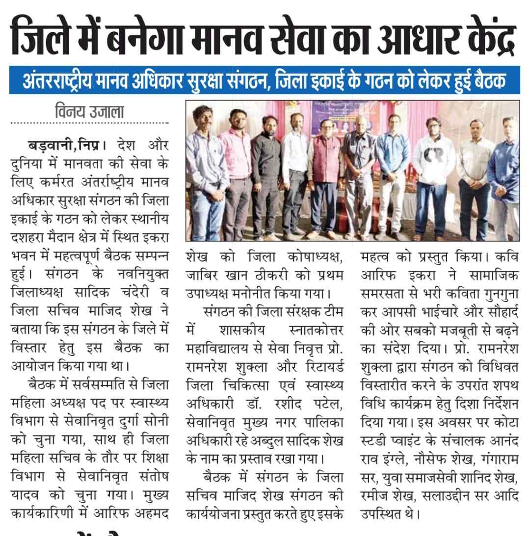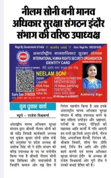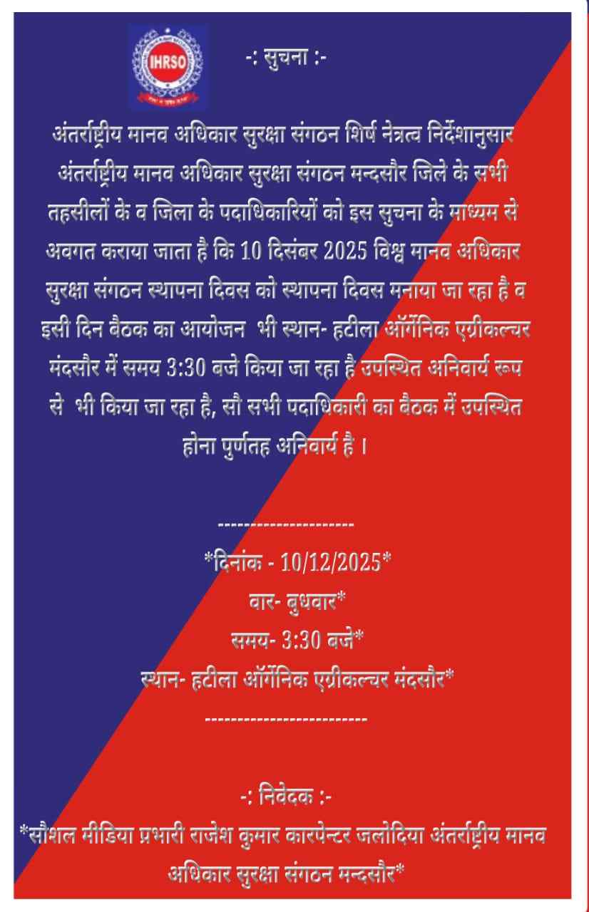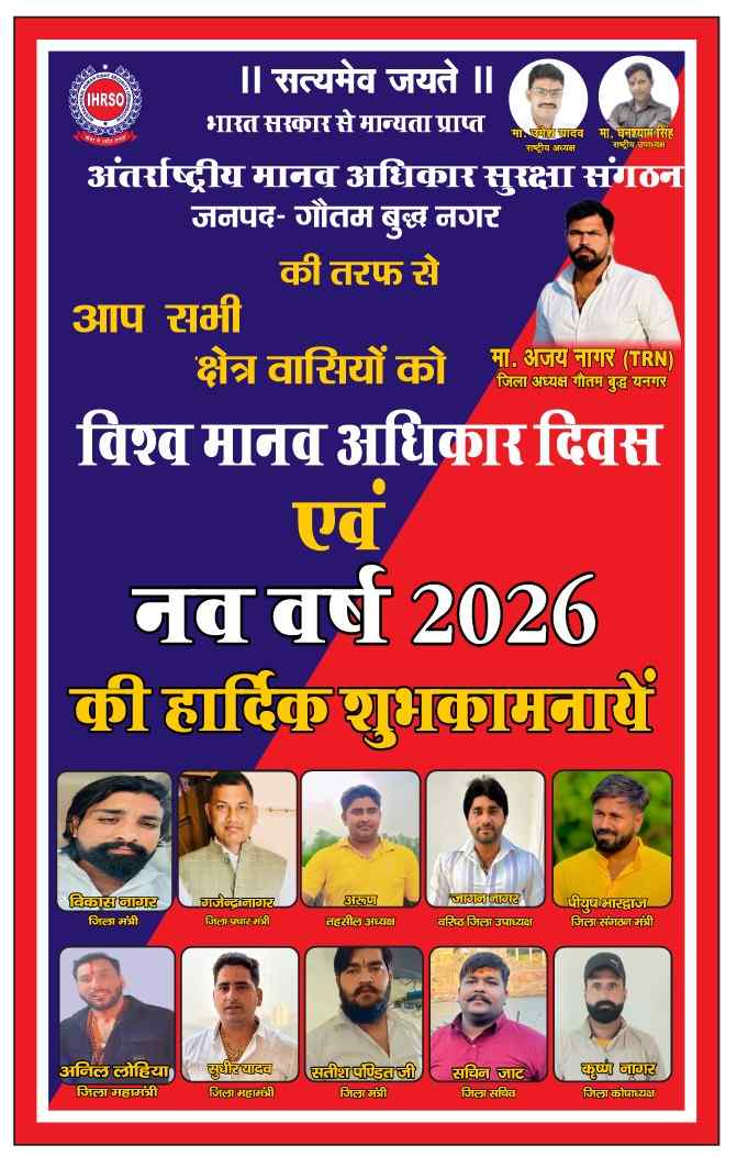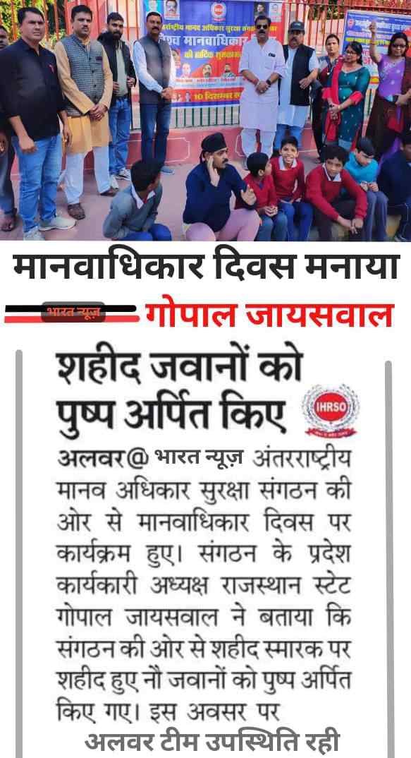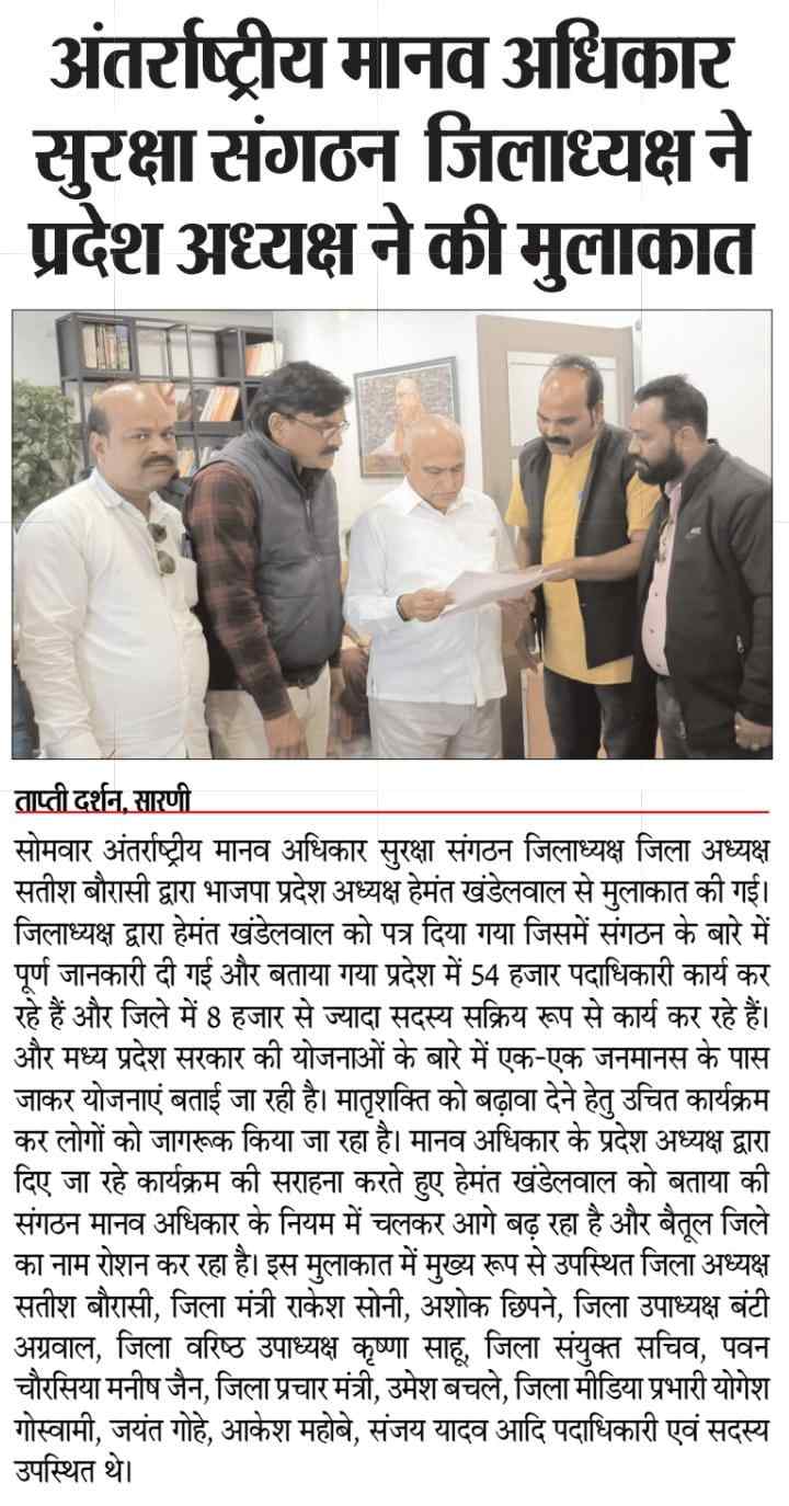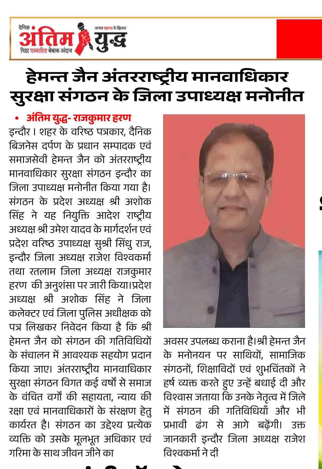 अंतर्राष्ट्रीय मानवाधिकार सुरक्षा संगठन 4 जनवरी वर्ष 2016 को उमेश यादव व घनश्याम सिंह व सीता यादव के द्वारा संगठन की स्थापना की गई है वर्ष 2016 से लगातार संगठन समाज हित मानव हित में काम कर रहा है जैसे मानव हनन जैसे मुद्दों पर लगातार कार्यरत है भ्रष्टाचार, महिला शोषण, रिश्वतखोरी, शिक्षा के लिए बच्चों को प्रेरित करना, बच्चों को निशुल्क शिक्षा प्रदान करना, गरीबों को कंबल वितरण करना, विधवा महिलाओं को साड़ी वितरण करना, मास्क वितरण करना, स्कूली बच्चों को कॉपी पेन किताब वितरण करना, वृद्धा आश्रम बनवाना, अनाथालय बनवाना आदि मुद्दों पर कार्यरत है संगठन भारत के 24 राज्यों में कार्य कर रहा है अंतर्राष्ट्रीय स्तर पर 3 देशों में कार्य कर रहा है नेपाल अमेरिका इटली प्रत्येक कार्यकर्ता मानव हित में समाज हित में कार्य कर रहा है और करता रहेगा