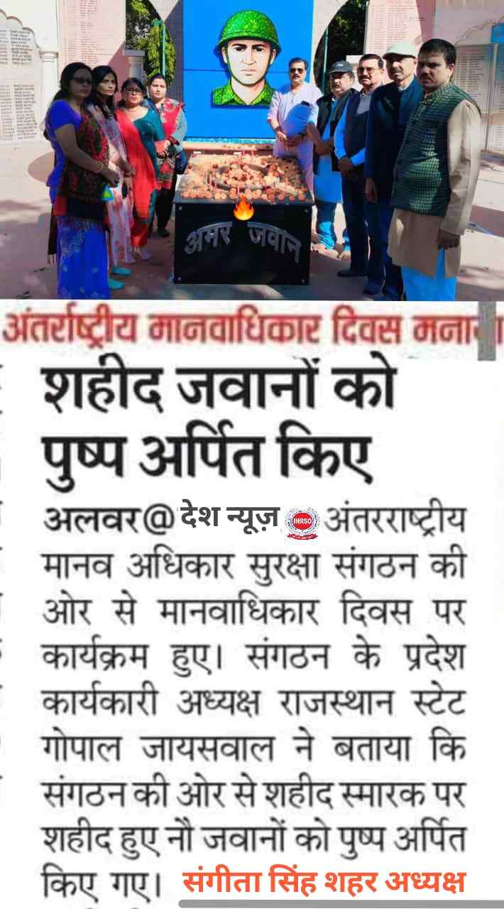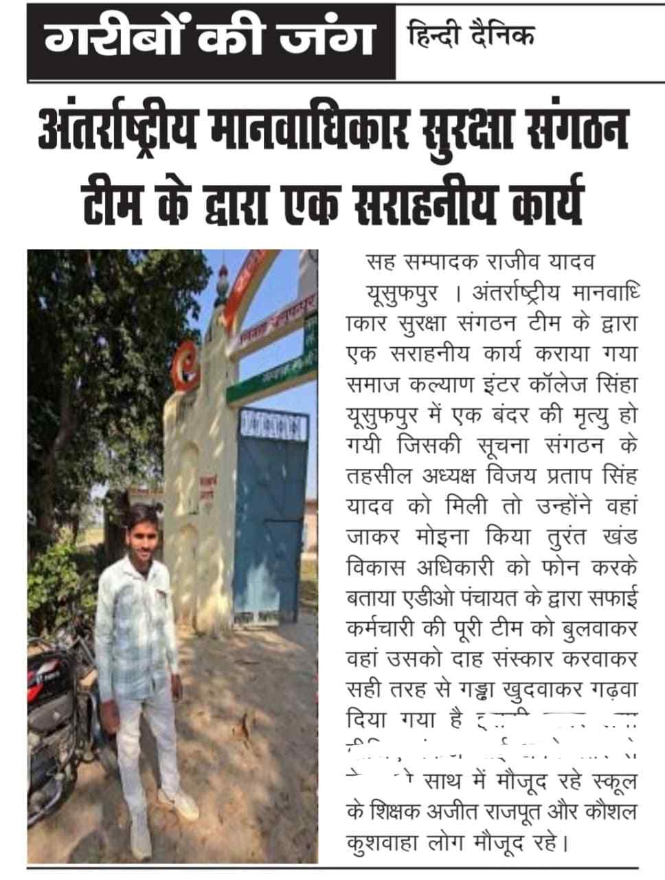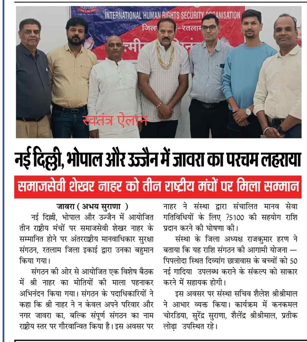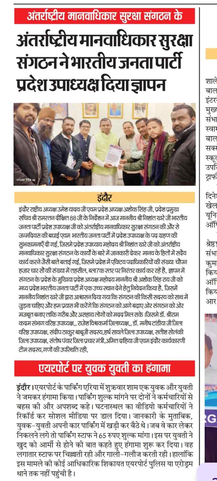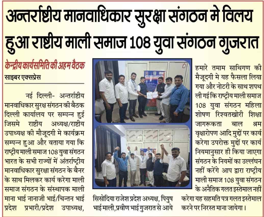 अंतर्राष्ट्रीय मानवाधिकार सुरक्षा संगठन 4 जनवरी वर्ष 2016 को उमेश यादव व घनश्याम सिंह व सीता यादव के द्वारा संगठन की स्थापना की गई है वर्ष 2016 से लगातार संगठन समाज हित मानव हित में काम कर रहा है जैसे मानव हनन जैसे मुद्दों पर लगातार कार्यरत है भ्रष्टाचार, महिला शोषण, रिश्वतखोरी, शिक्षा के लिए बच्चों को प्रेरित करना, बच्चों को निशुल्क शिक्षा प्रदान करना, गरीबों को कंबल वितरण करना, विधवा महिलाओं को साड़ी वितरण करना, मास्क वितरण करना, स्कूली बच्चों को कॉपी पेन किताब वितरण करना, वृद्धा आश्रम बनवाना, अनाथालय बनवाना आदि मुद्दों पर कार्यरत है संगठन भारत के 24 राज्यों में कार्य कर रहा है अंतर्राष्ट्रीय स्तर पर 3 देशों में कार्य कर रहा है नेपाल अमेरिका इटली प्रत्येक कार्यकर्ता मानव हित में समाज हित में कार्य कर रहा है और करता रहेगा