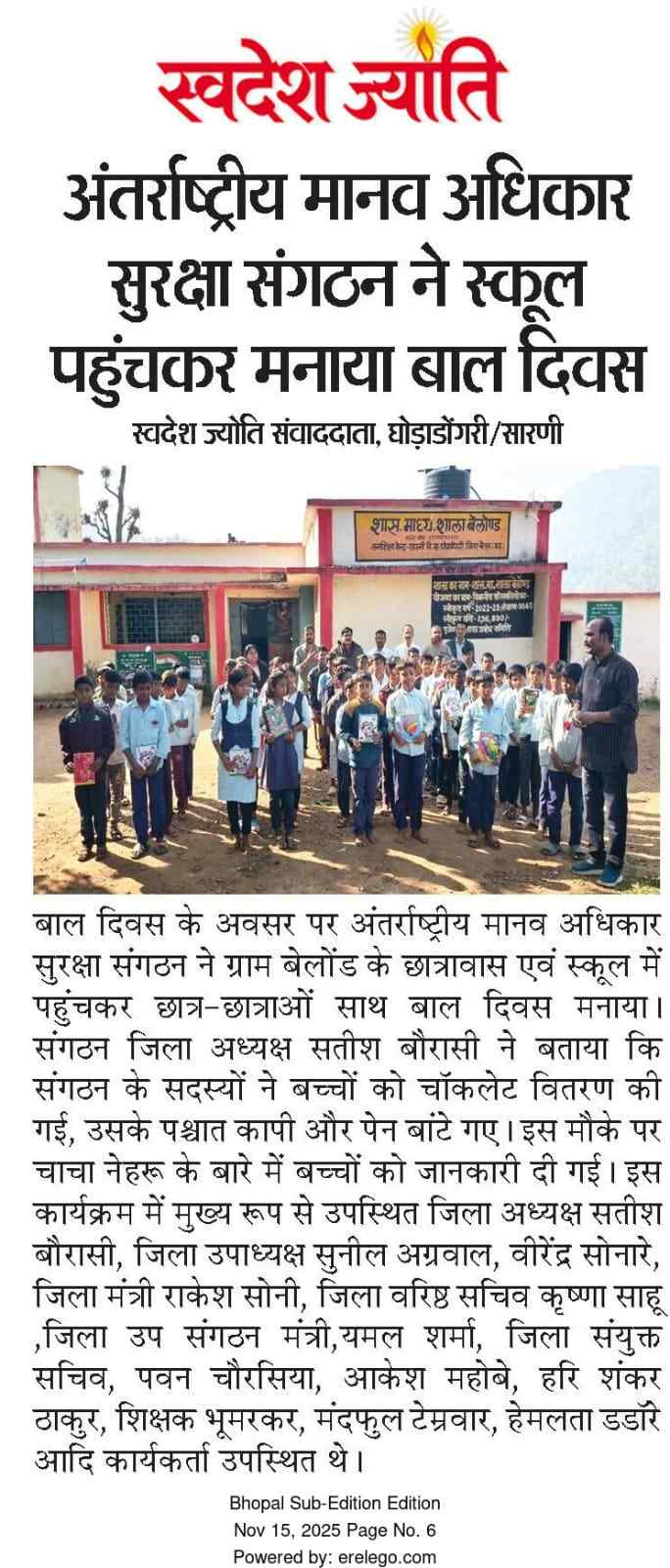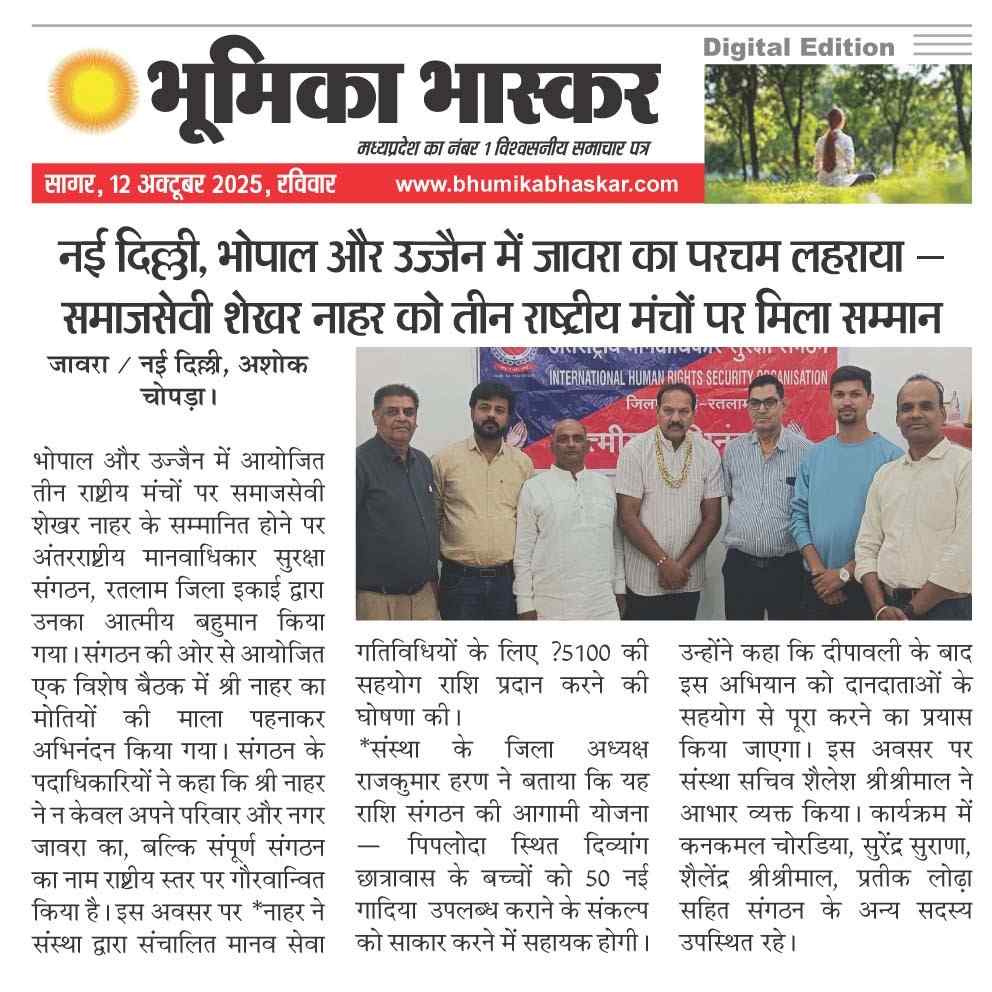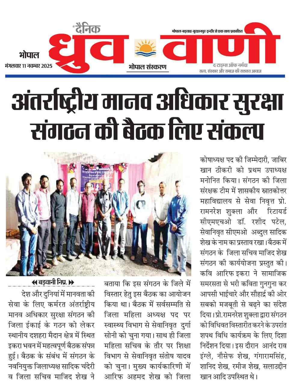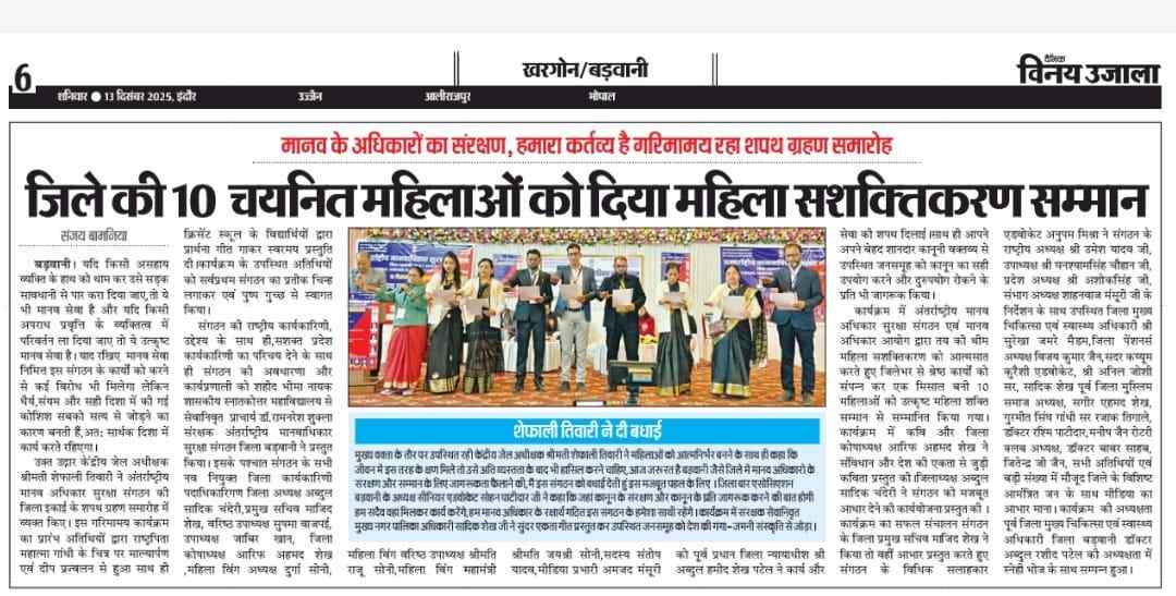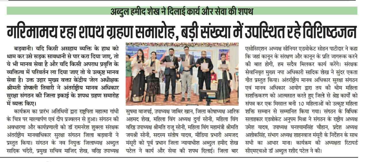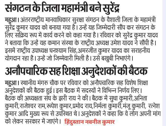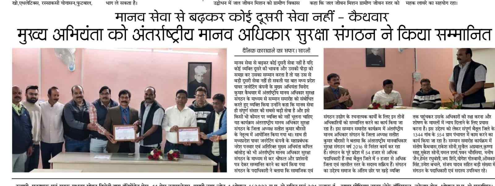 अंतर्राष्ट्रीय मानवाधिकार सुरक्षा संगठन 4 जनवरी वर्ष 2016 को उमेश यादव व घनश्याम सिंह व सीता यादव के द्वारा संगठन की स्थापना की गई है वर्ष 2016 से लगातार संगठन समाज हित मानव हित में काम कर रहा है जैसे मानव हनन जैसे मुद्दों पर लगातार कार्यरत है भ्रष्टाचार, महिला शोषण, रिश्वतखोरी, शिक्षा के लिए बच्चों को प्रेरित करना, बच्चों को निशुल्क शिक्षा प्रदान करना, गरीबों को कंबल वितरण करना, विधवा महिलाओं को साड़ी वितरण करना, मास्क वितरण करना, स्कूली बच्चों को कॉपी पेन किताब वितरण करना, वृद्धा आश्रम बनवाना, अनाथालय बनवाना आदि मुद्दों पर कार्यरत है संगठन भारत के 24 राज्यों में कार्य कर रहा है अंतर्राष्ट्रीय स्तर पर 3 देशों में कार्य कर रहा है नेपाल अमेरिका इटली प्रत्येक कार्यकर्ता मानव हित में समाज हित में कार्य कर रहा है और करता रहेगा