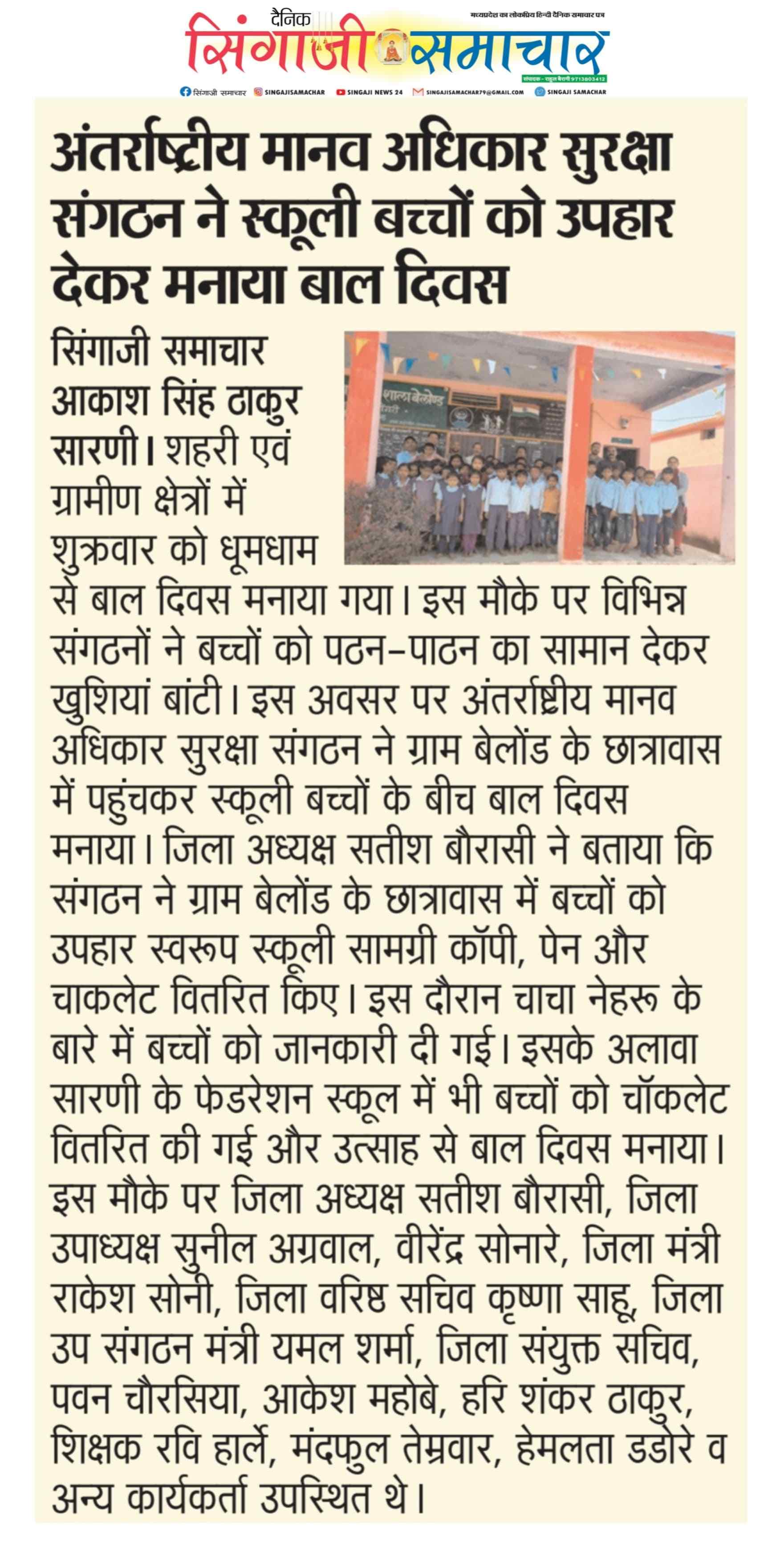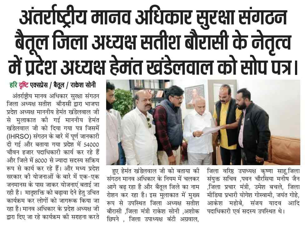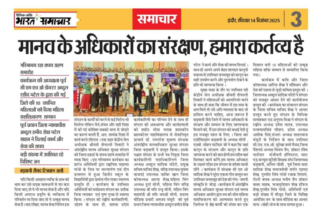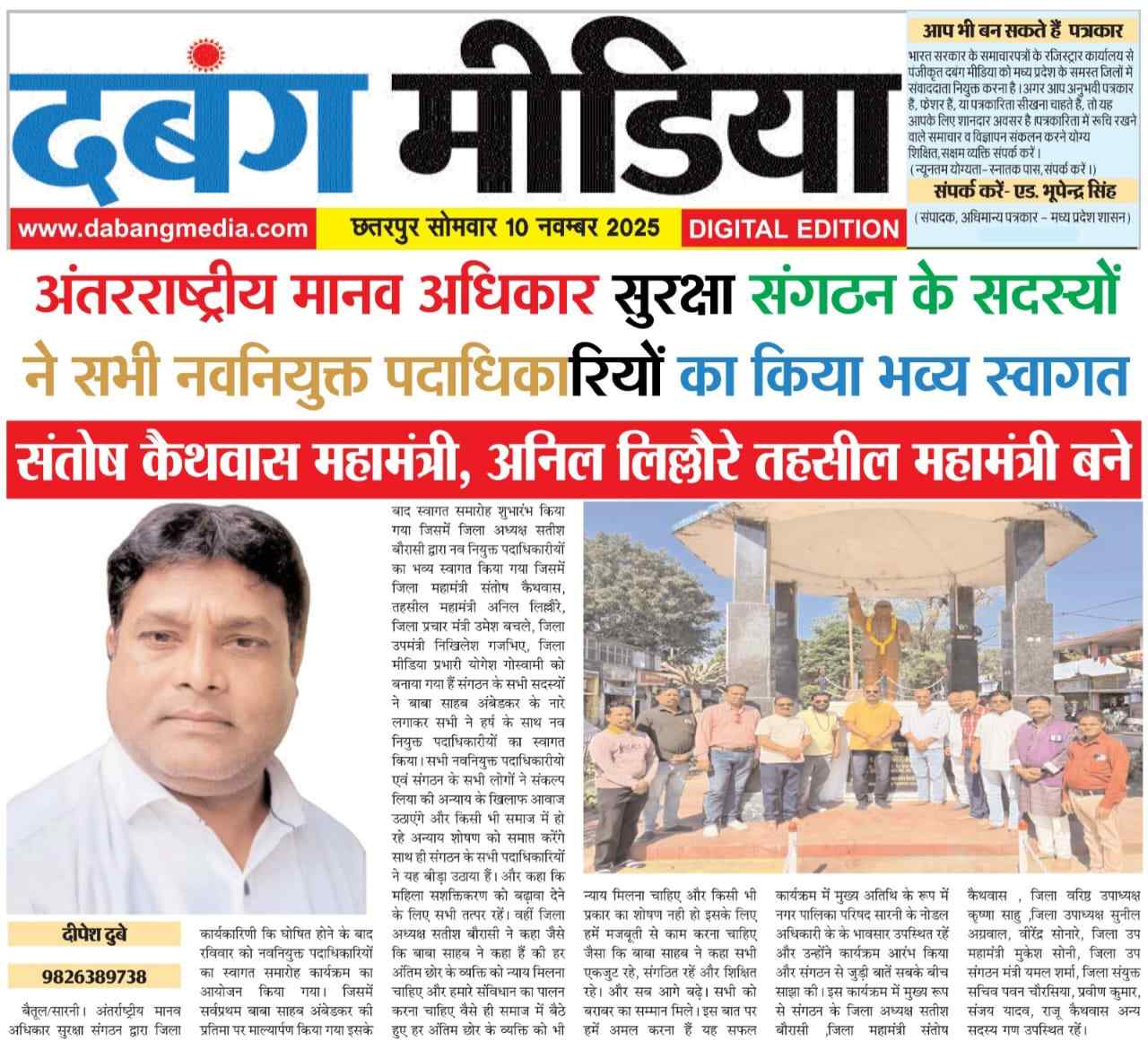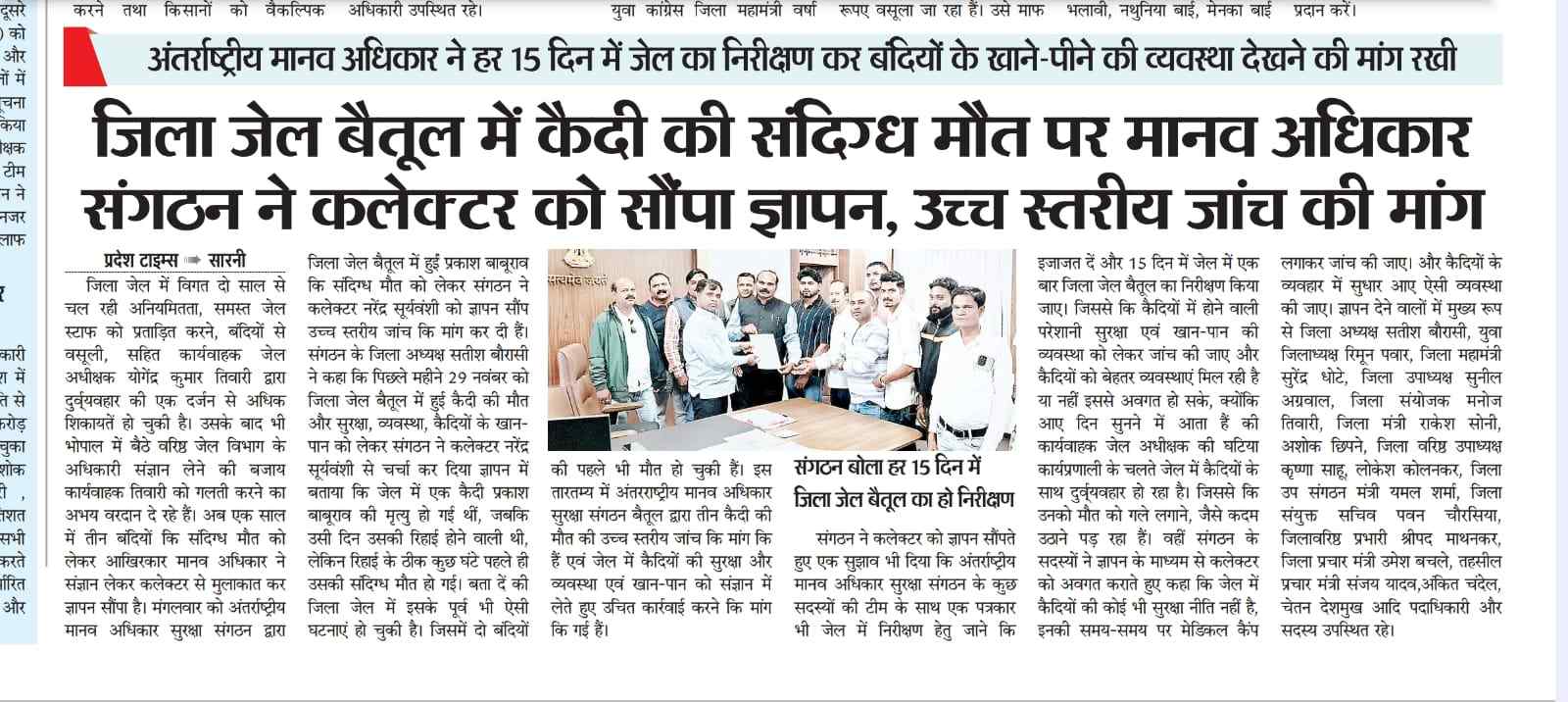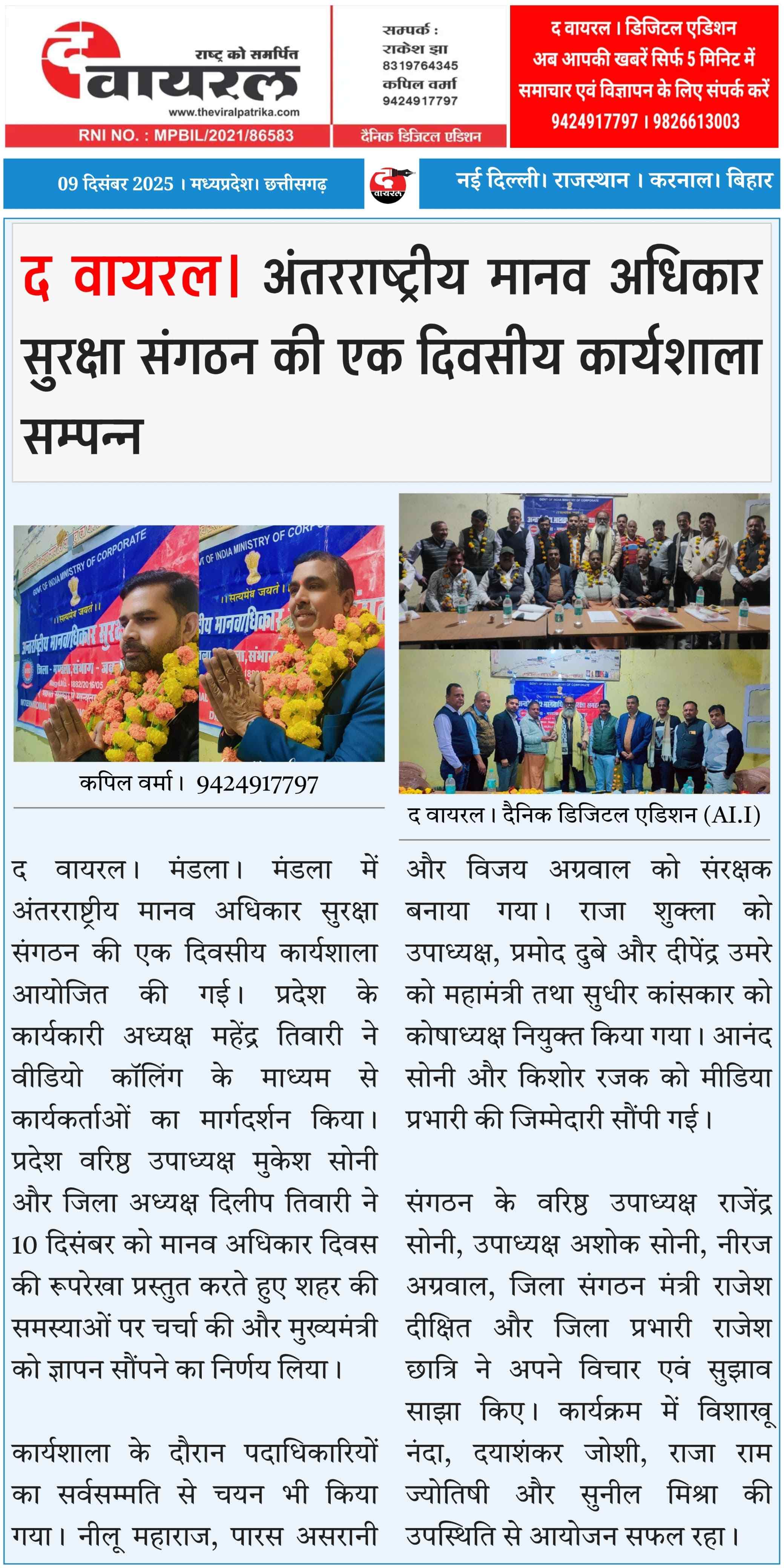 अंतर्राष्ट्रीय मानवाधिकार सुरक्षा संगठन 4 जनवरी वर्ष 2016 को उमेश यादव व घनश्याम सिंह व सीता यादव के द्वारा संगठन की स्थापना की गई है वर्ष 2016 से लगातार संगठन समाज हित मानव हित में काम कर रहा है जैसे मानव हनन जैसे मुद्दों पर लगातार कार्यरत है भ्रष्टाचार, महिला शोषण, रिश्वतखोरी, शिक्षा के लिए बच्चों को प्रेरित करना, बच्चों को निशुल्क शिक्षा प्रदान करना, गरीबों को कंबल वितरण करना, विधवा महिलाओं को साड़ी वितरण करना, मास्क वितरण करना, स्कूली बच्चों को कॉपी पेन किताब वितरण करना, वृद्धा आश्रम बनवाना, अनाथालय बनवाना आदि मुद्दों पर कार्यरत है संगठन भारत के 24 राज्यों में कार्य कर रहा है अंतर्राष्ट्रीय स्तर पर 3 देशों में कार्य कर रहा है नेपाल अमेरिका इटली प्रत्येक कार्यकर्ता मानव हित में समाज हित में कार्य कर रहा है और करता रहेगा