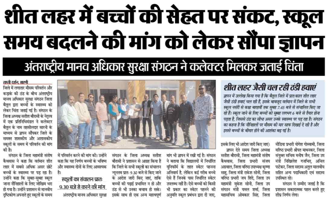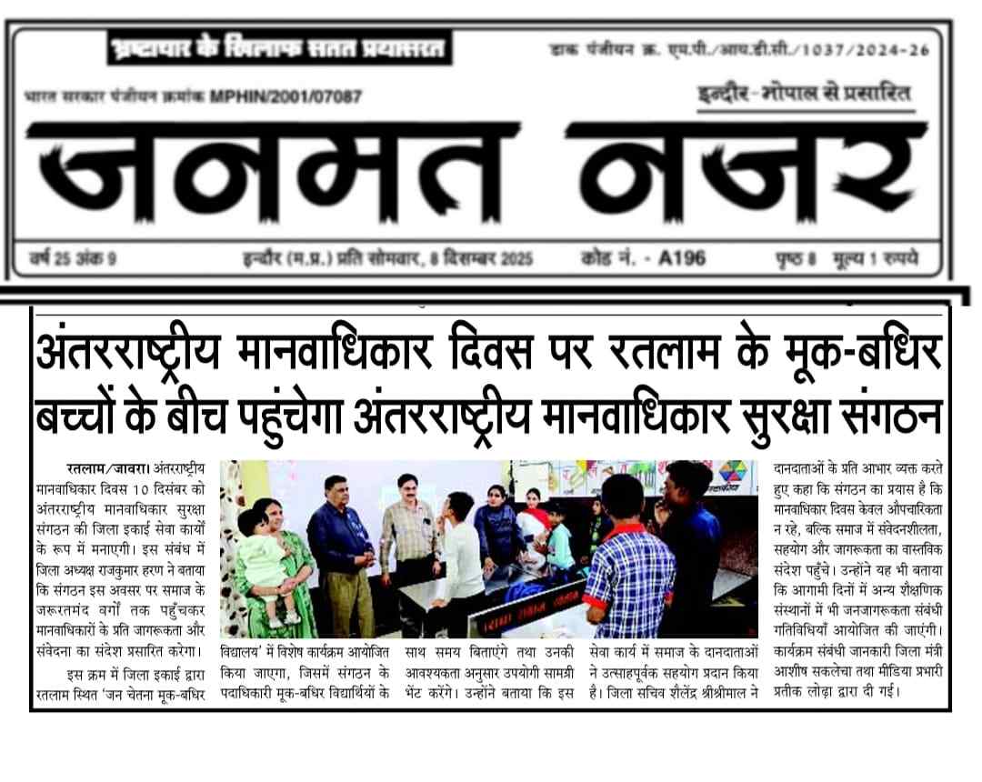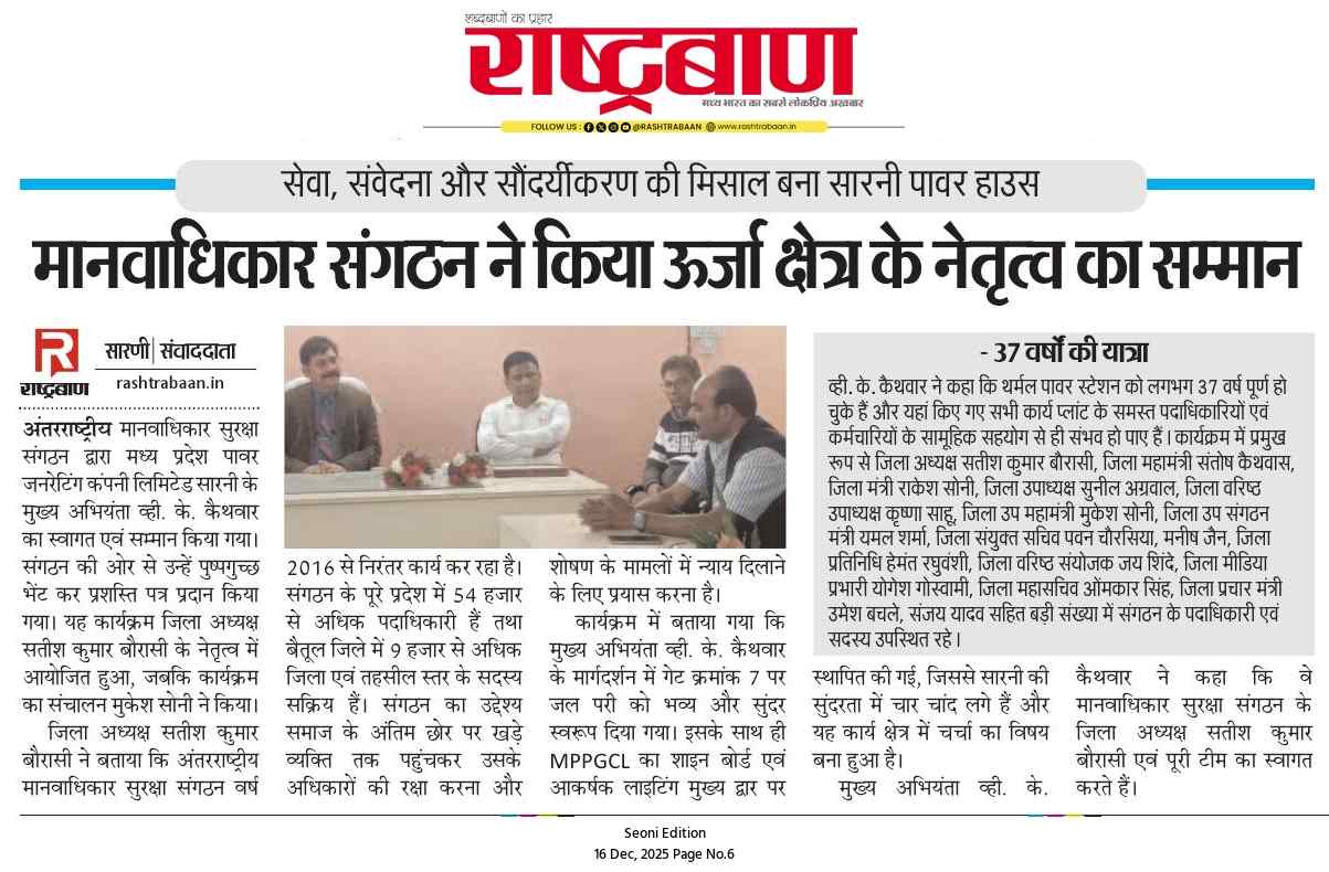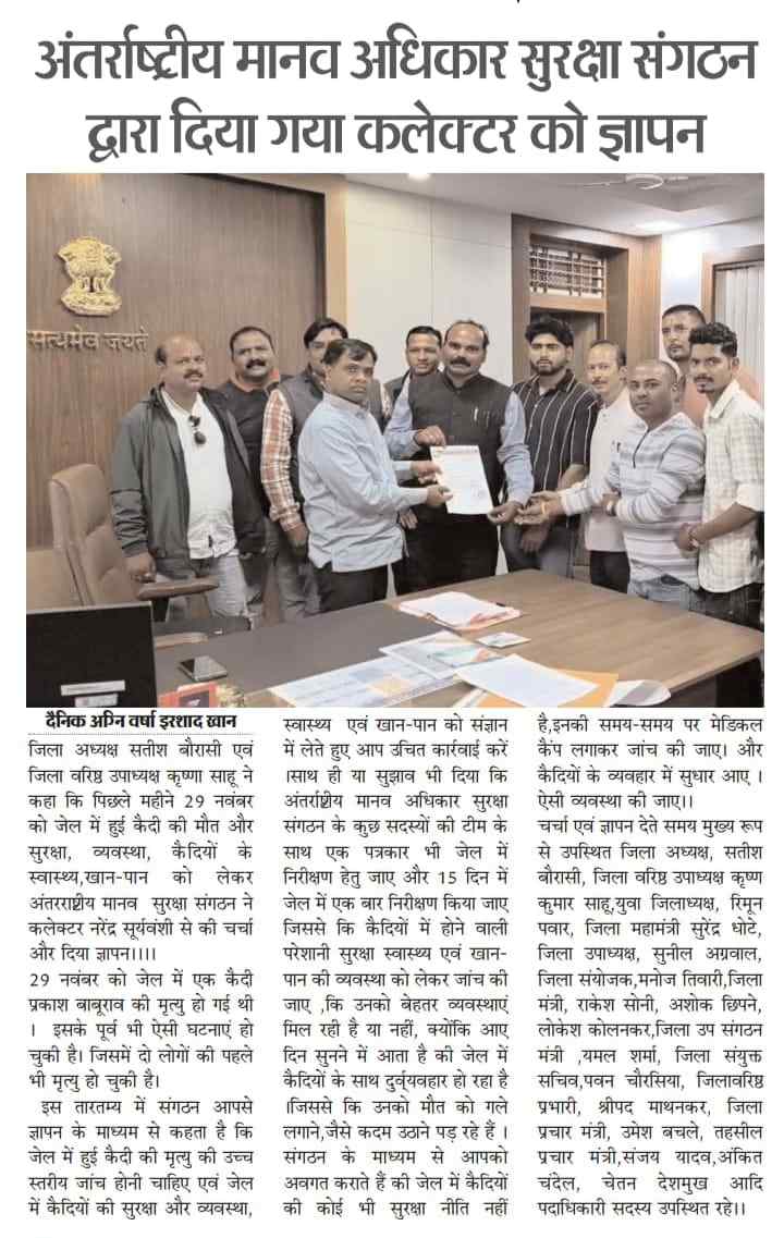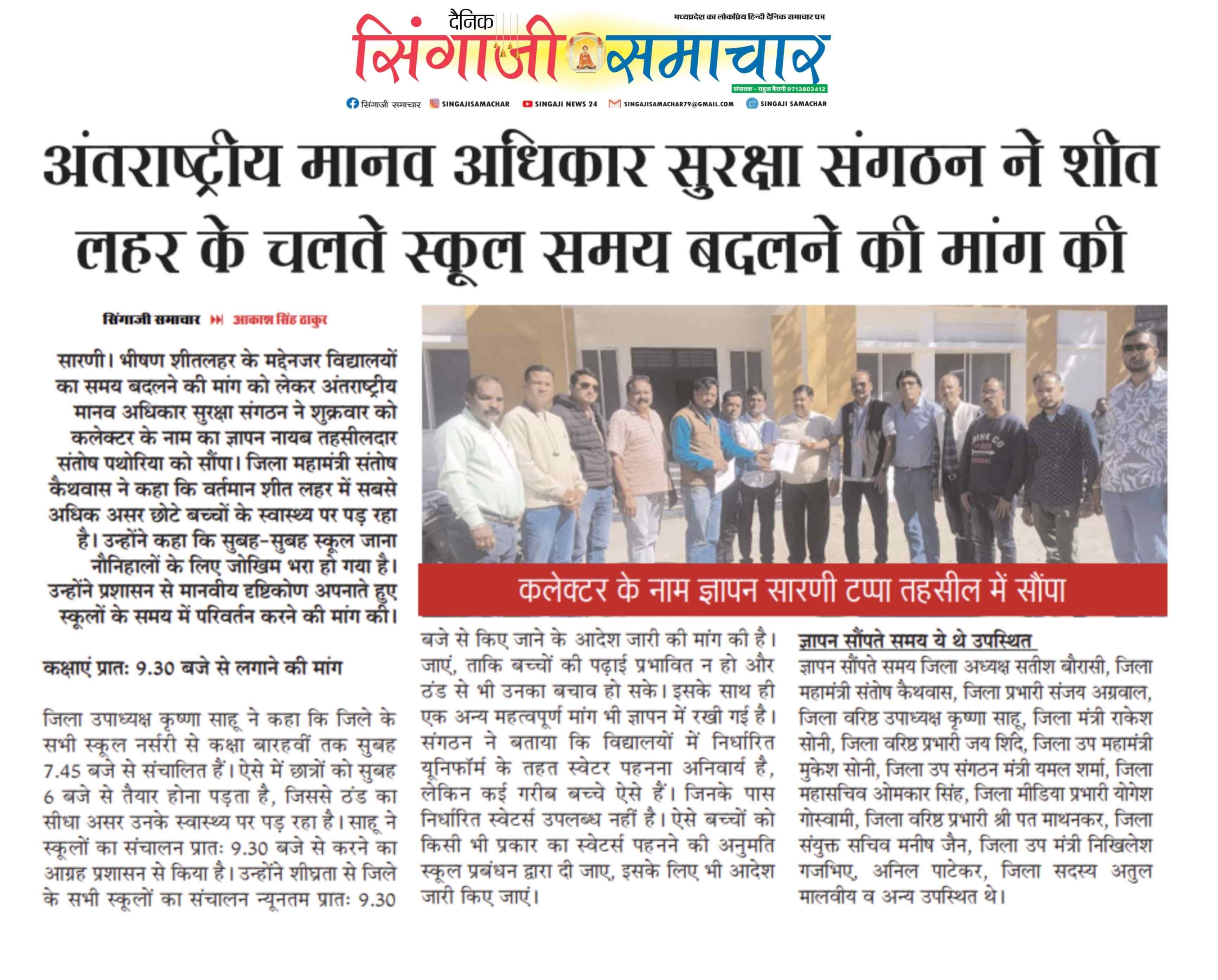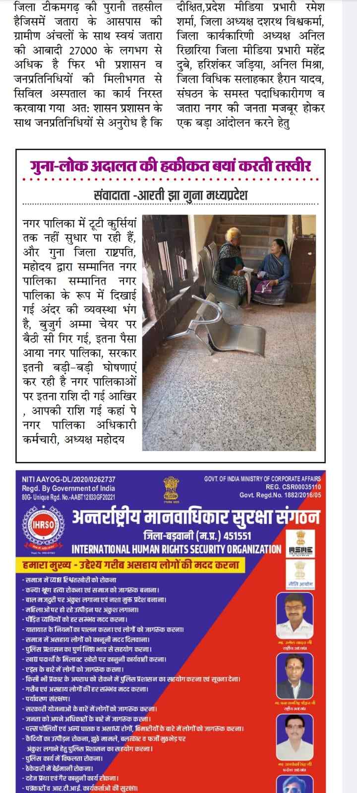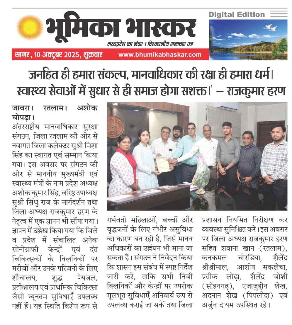 अंतर्राष्ट्रीय मानवाधिकार सुरक्षा संगठन 4 जनवरी वर्ष 2016 को उमेश यादव व घनश्याम सिंह व सीता यादव के द्वारा संगठन की स्थापना की गई है वर्ष 2016 से लगातार संगठन समाज हित मानव हित में काम कर रहा है जैसे मानव हनन जैसे मुद्दों पर लगातार कार्यरत है भ्रष्टाचार, महिला शोषण, रिश्वतखोरी, शिक्षा के लिए बच्चों को प्रेरित करना, बच्चों को निशुल्क शिक्षा प्रदान करना, गरीबों को कंबल वितरण करना, विधवा महिलाओं को साड़ी वितरण करना, मास्क वितरण करना, स्कूली बच्चों को कॉपी पेन किताब वितरण करना, वृद्धा आश्रम बनवाना, अनाथालय बनवाना आदि मुद्दों पर कार्यरत है संगठन भारत के 24 राज्यों में कार्य कर रहा है अंतर्राष्ट्रीय स्तर पर 3 देशों में कार्य कर रहा है नेपाल अमेरिका इटली प्रत्येक कार्यकर्ता मानव हित में समाज हित में कार्य कर रहा है और करता रहेगा