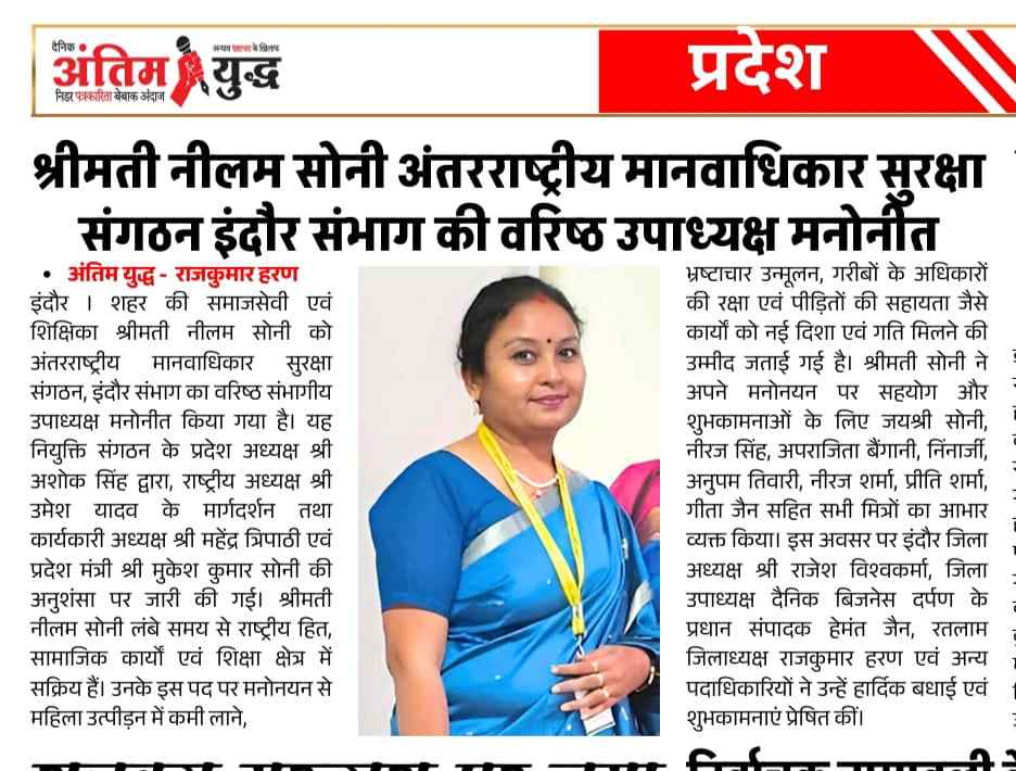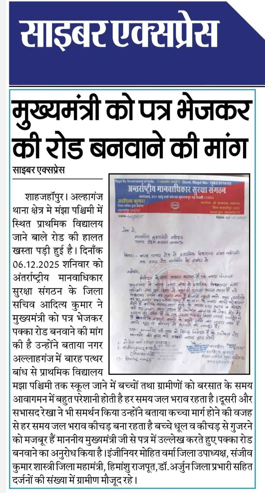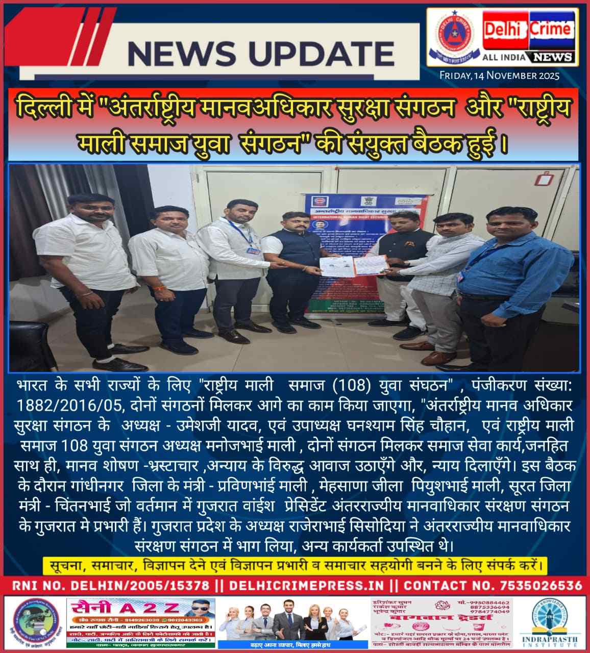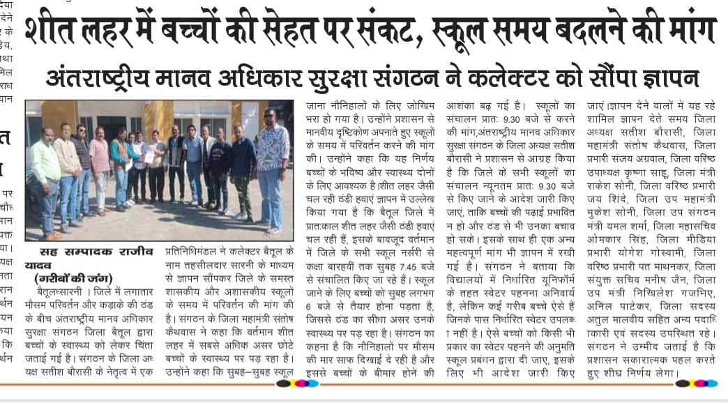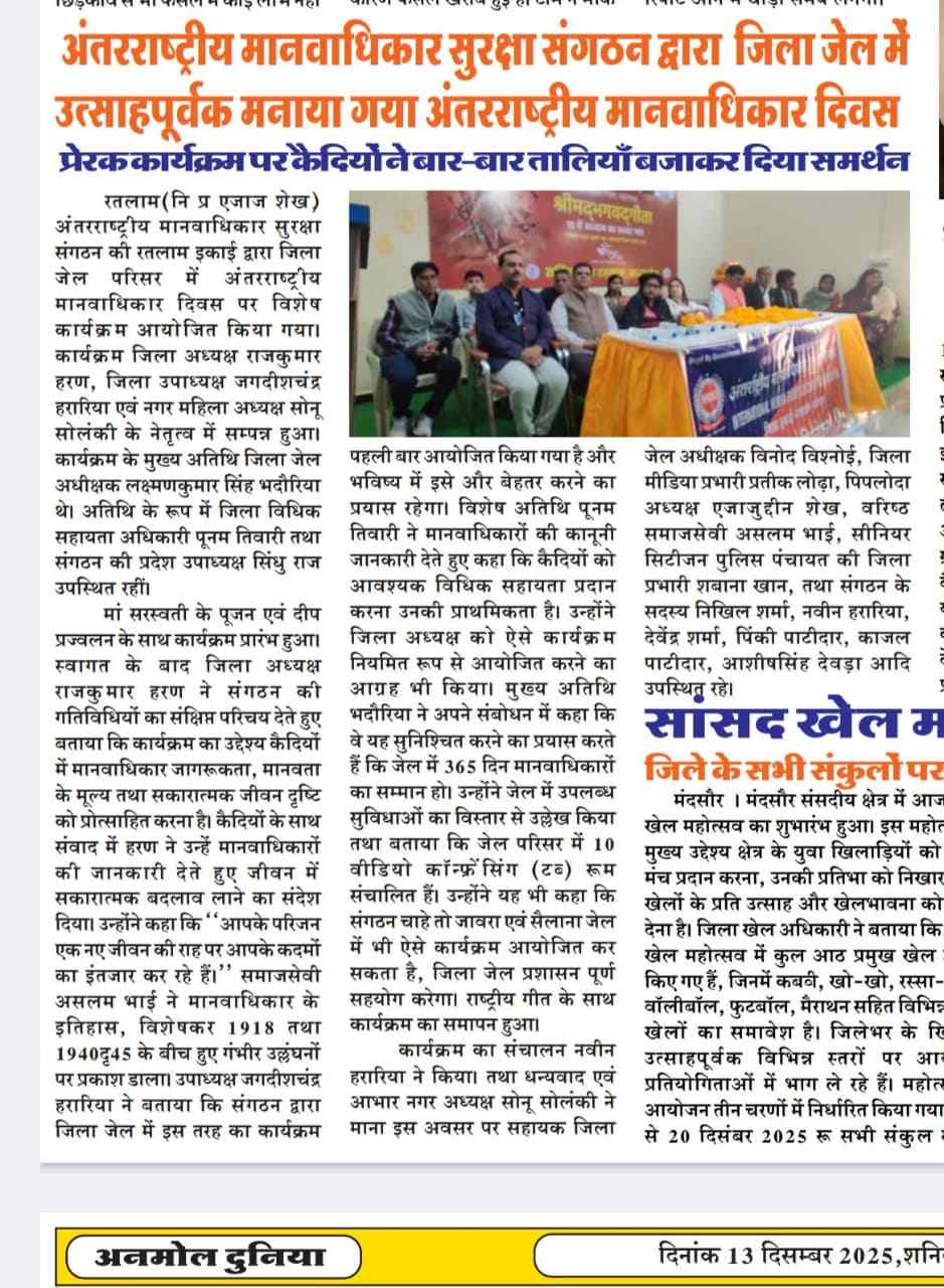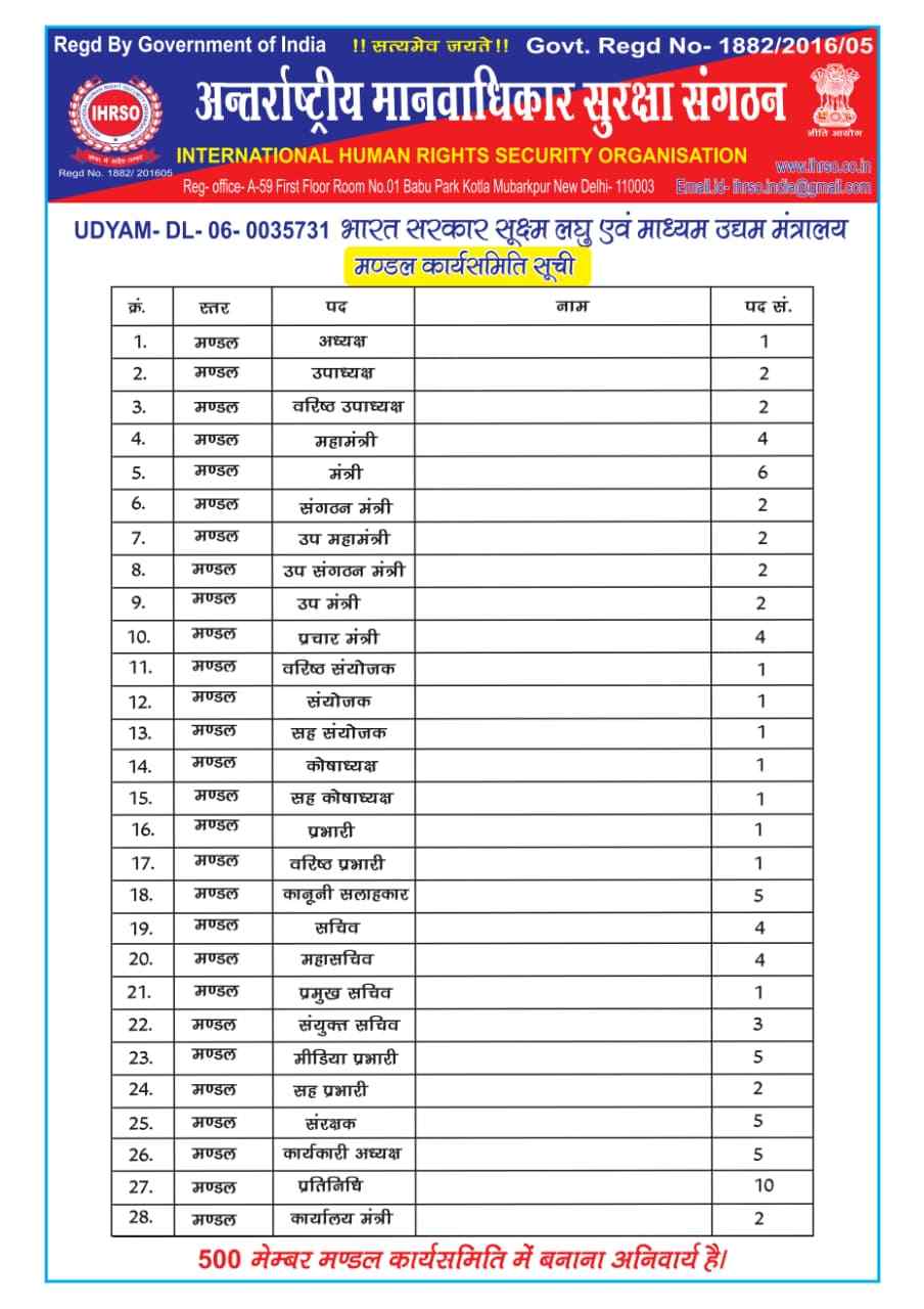 अंतर्राष्ट्रीय मानवाधिकार सुरक्षा संगठन 4 जनवरी वर्ष 2016 को उमेश यादव व घनश्याम सिंह व सीता यादव के द्वारा संगठन की स्थापना की गई है वर्ष 2016 से लगातार संगठन समाज हित मानव हित में काम कर रहा है जैसे मानव हनन जैसे मुद्दों पर लगातार कार्यरत है भ्रष्टाचार, महिला शोषण, रिश्वतखोरी, शिक्षा के लिए बच्चों को प्रेरित करना, बच्चों को निशुल्क शिक्षा प्रदान करना, गरीबों को कंबल वितरण करना, विधवा महिलाओं को साड़ी वितरण करना, मास्क वितरण करना, स्कूली बच्चों को कॉपी पेन किताब वितरण करना, वृद्धा आश्रम बनवाना, अनाथालय बनवाना आदि मुद्दों पर कार्यरत है संगठन भारत के 24 राज्यों में कार्य कर रहा है अंतर्राष्ट्रीय स्तर पर 3 देशों में कार्य कर रहा है नेपाल अमेरिका इटली प्रत्येक कार्यकर्ता मानव हित में समाज हित में कार्य कर रहा है और करता रहेगा