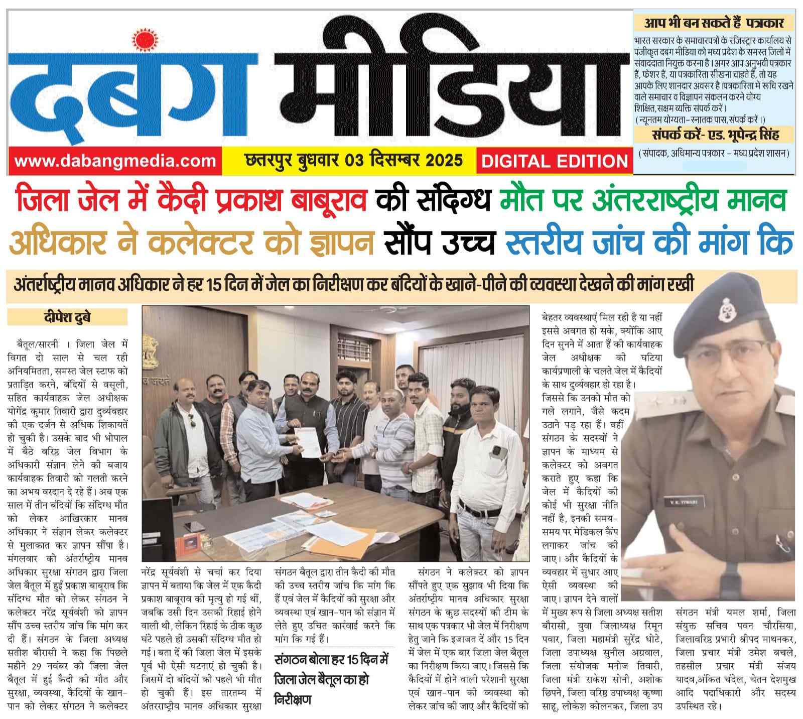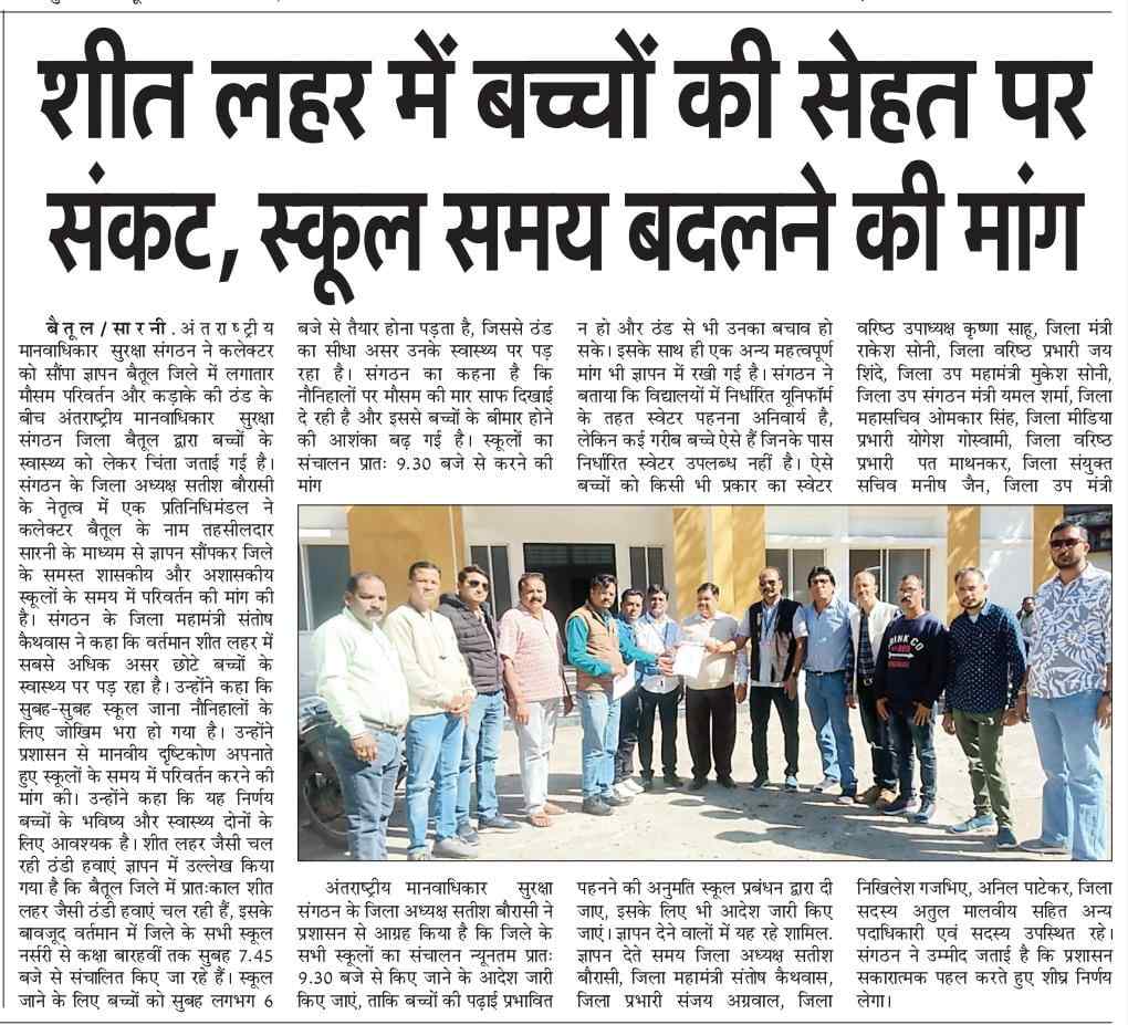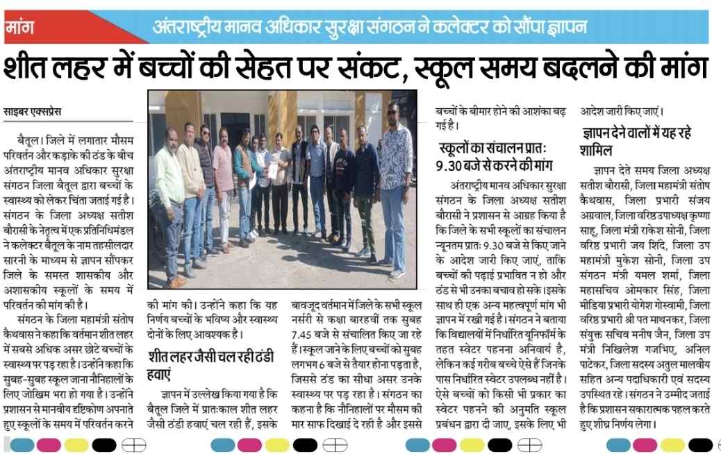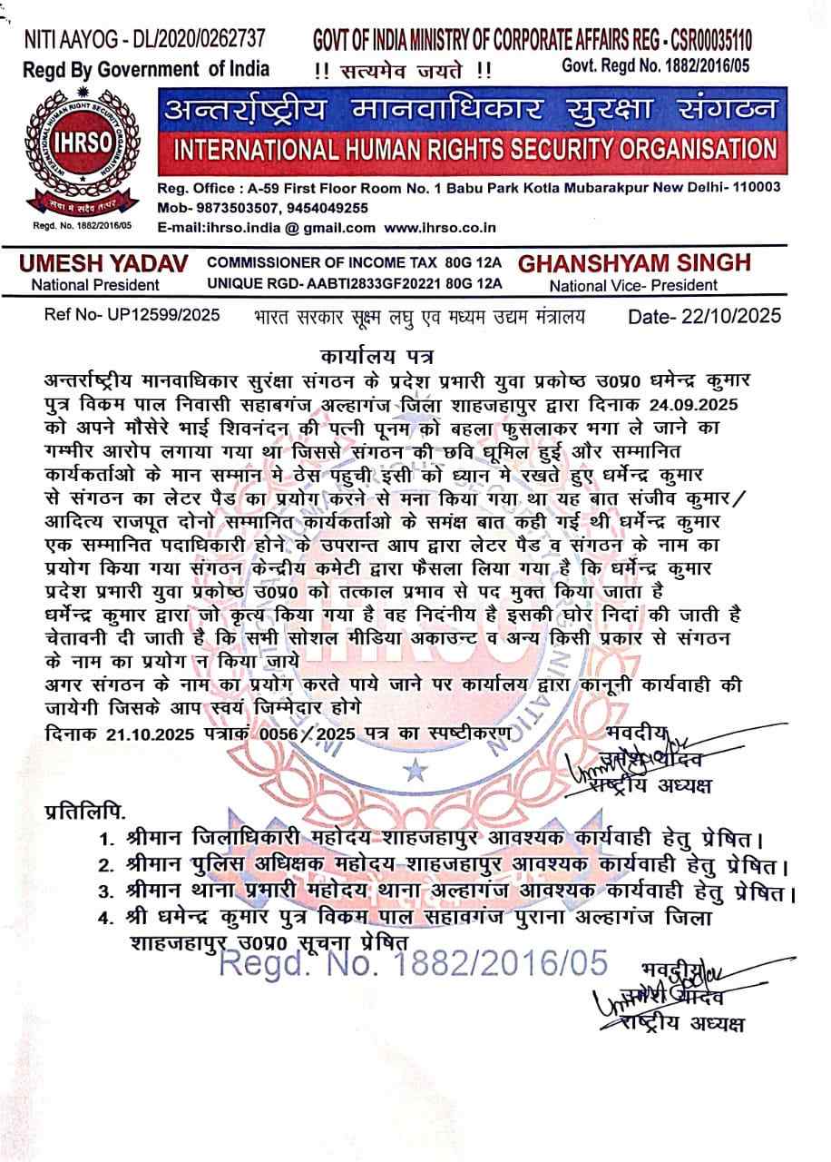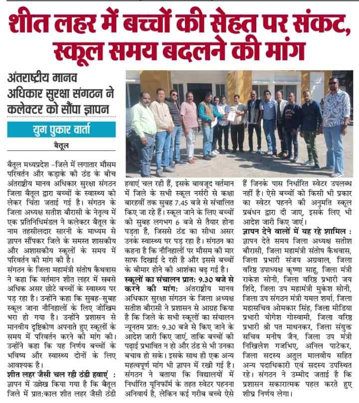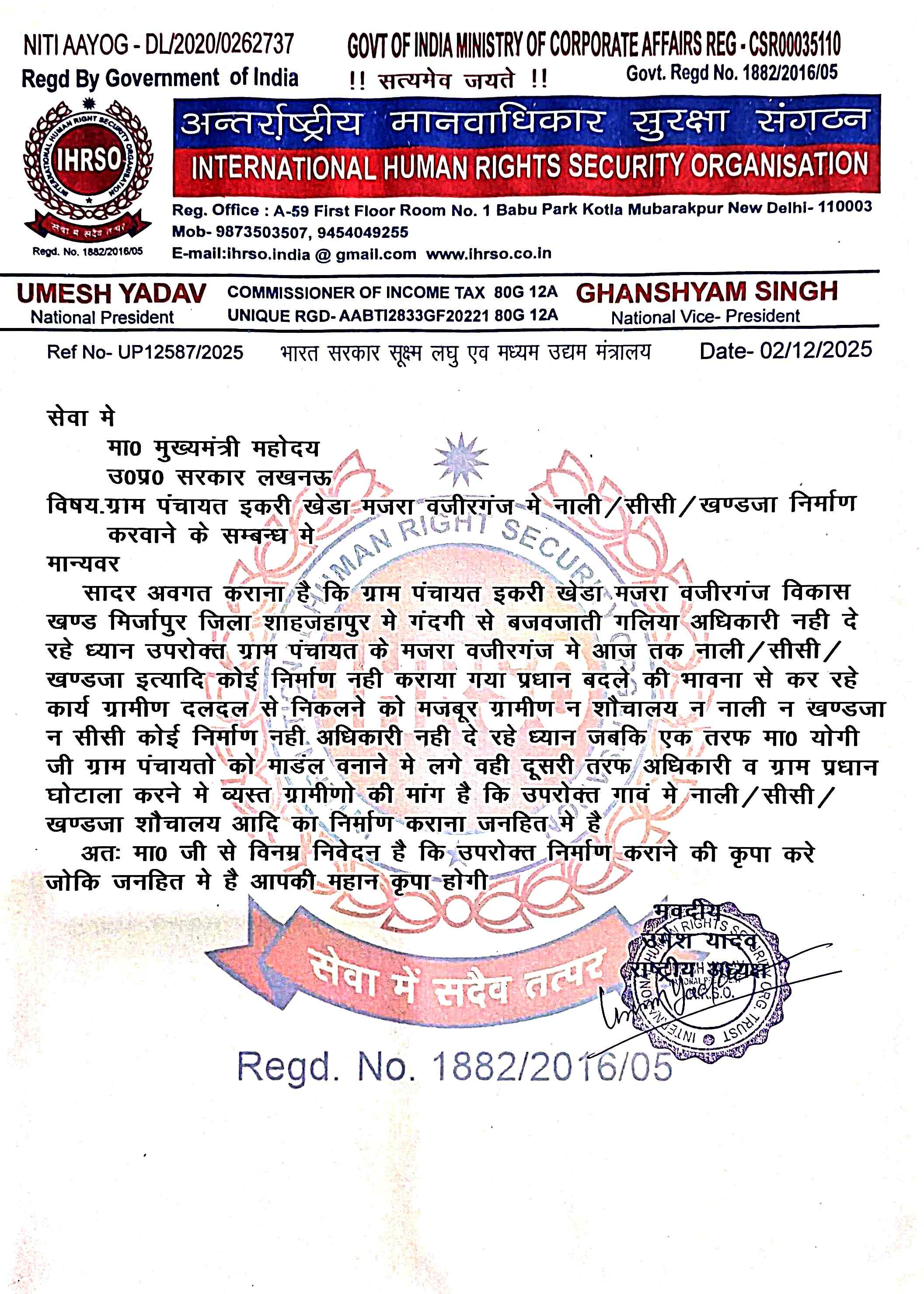 अंतर्राष्ट्रीय मानवाधिकार सुरक्षा संगठन 4 जनवरी वर्ष 2016 को उमेश यादव व घनश्याम सिंह व सीता यादव के द्वारा संगठन की स्थापना की गई है वर्ष 2016 से लगातार संगठन समाज हित मानव हित में काम कर रहा है जैसे मानव हनन जैसे मुद्दों पर लगातार कार्यरत है भ्रष्टाचार, महिला शोषण, रिश्वतखोरी, शिक्षा के लिए बच्चों को प्रेरित करना, बच्चों को निशुल्क शिक्षा प्रदान करना, गरीबों को कंबल वितरण करना, विधवा महिलाओं को साड़ी वितरण करना, मास्क वितरण करना, स्कूली बच्चों को कॉपी पेन किताब वितरण करना, वृद्धा आश्रम बनवाना, अनाथालय बनवाना आदि मुद्दों पर कार्यरत है संगठन भारत के 24 राज्यों में कार्य कर रहा है अंतर्राष्ट्रीय स्तर पर 3 देशों में कार्य कर रहा है नेपाल अमेरिका इटली प्रत्येक कार्यकर्ता मानव हित में समाज हित में कार्य कर रहा है और करता रहेगा